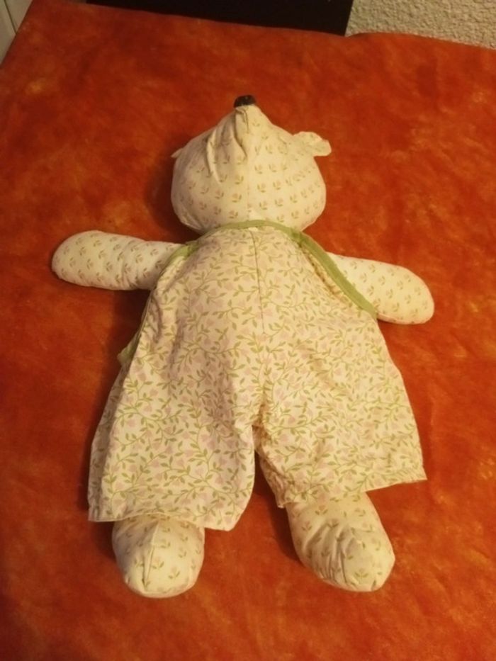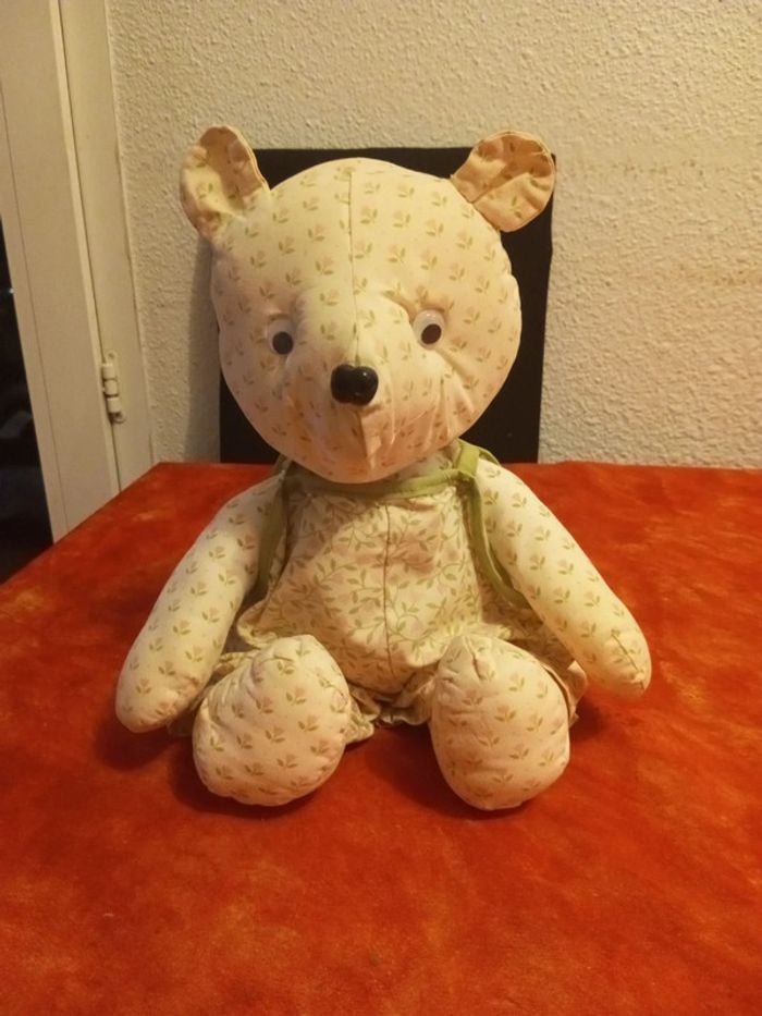 Ours avec salopette en tissus memories, liberty , peut être une fabrication artisanale , imprimé fleurs. Très bon état, vendu comme sur les différentes photos. Dans mon dressing, il y a d'autres ours, des doudous, des Petshop, des Lego Duplo, des Playmobil, des Barbie et beaucoup de peluches, jeux et jouets Vintage
