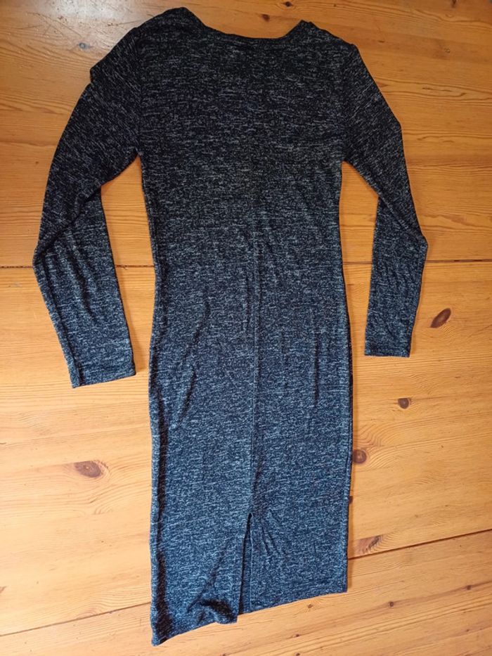 Robe gris foncé chiné longue, légèrement fendue derrière. Taille S.