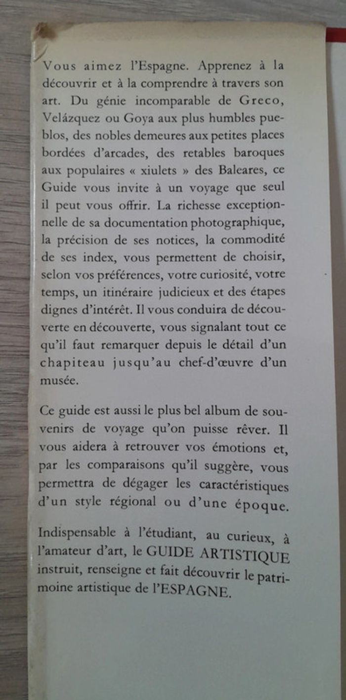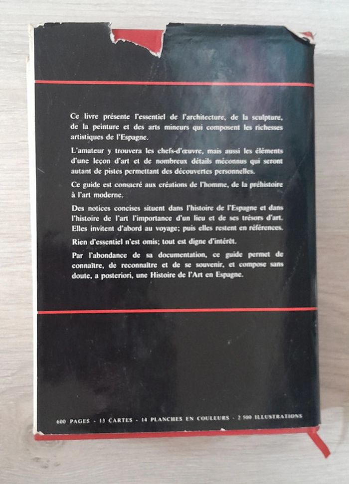 L'essentiel de l'architecture, de la sculpture, de la peinture et des arts mineurs qui composent les richesses du patrimoine artistique de l'Espagne Couverture de protection abimee 24x17cm 559 pages