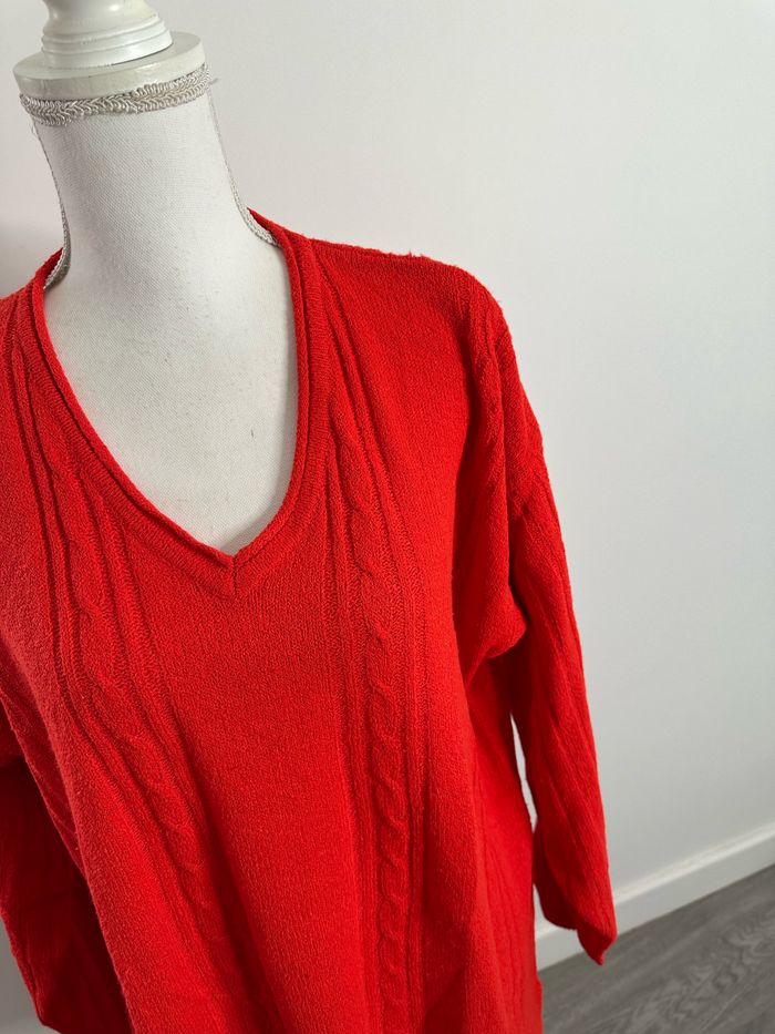 Pull - Excellent état - Taille unique, ok du 36 au 48 - Maille torsades - Coupe oversize, loose - Orange vif comme sur les photos - Vintage, années 80’ - Col en V - Ultra doux et chaud - 100% Acrylique - Plus d’étiquette de taille Dimensions: - 60cm niveau épaules - 60cm niveau aisselles - 74cm de long