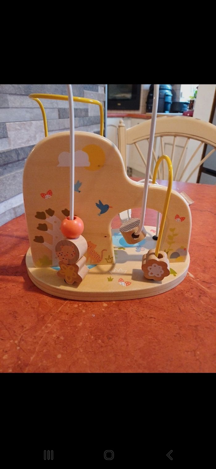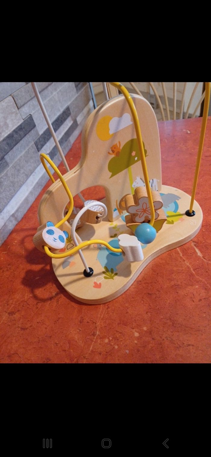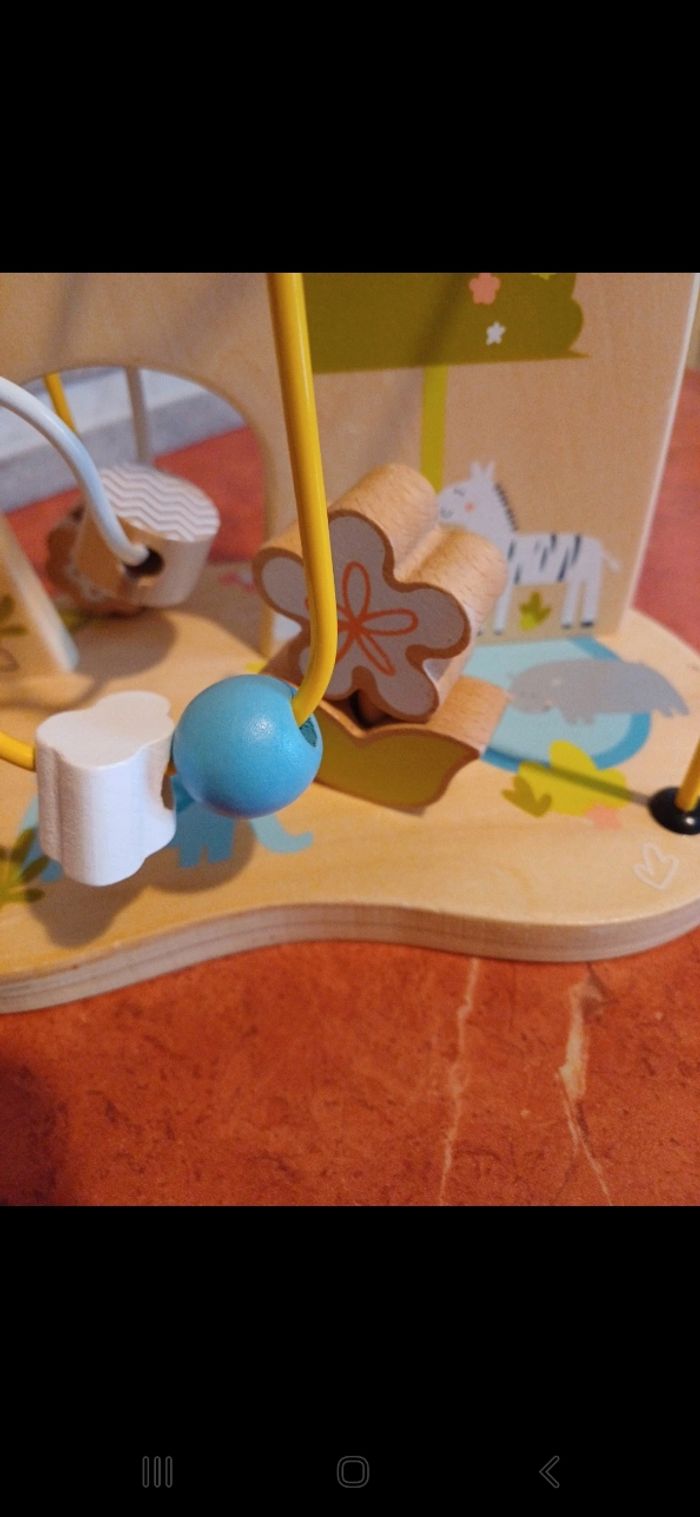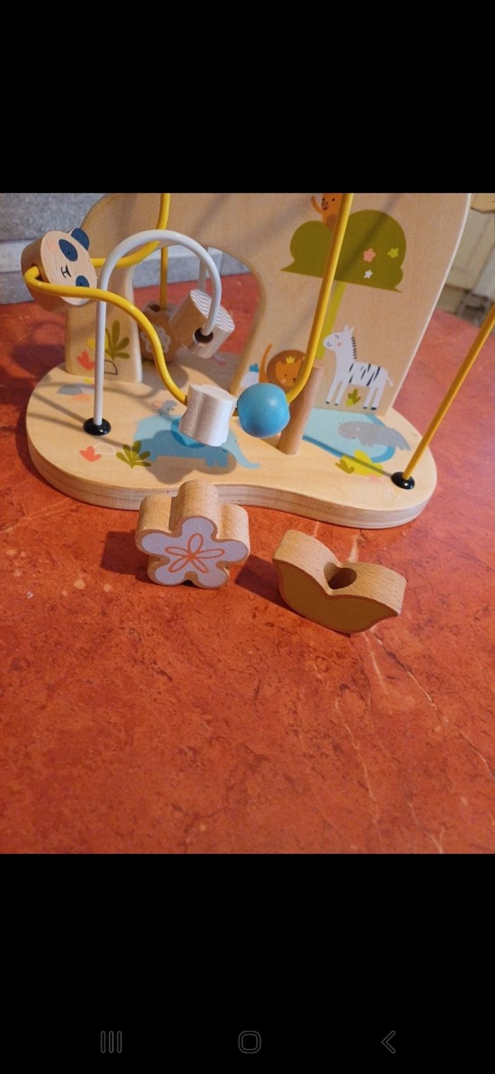 Animaux , boucles et autres formes en bois à faire glisser. Petite fleur à empiler sur le devant. Un ou deux petits defauts à peine visible ( voir photo). Idéal à partir de 12 mois