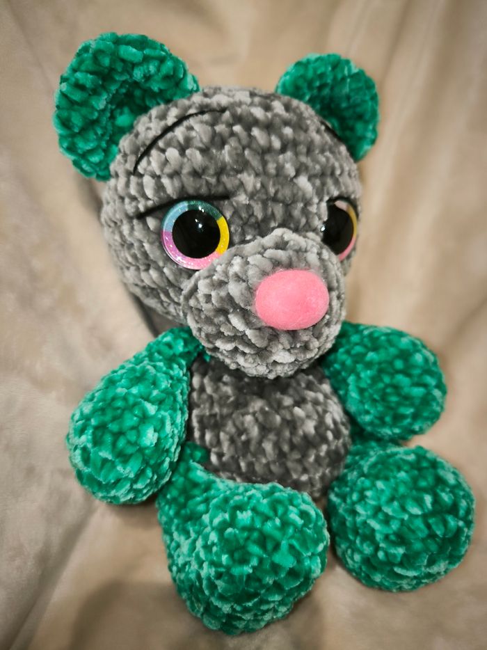 Ourson gris et vert au crochet réalisé à la main. Yeux sécurisés. Laine velours. Ne convient pas aux enfants de moins de 3 ans. Peut être utilisé en décoration sans problème. Il mesure environ 25cm de haut