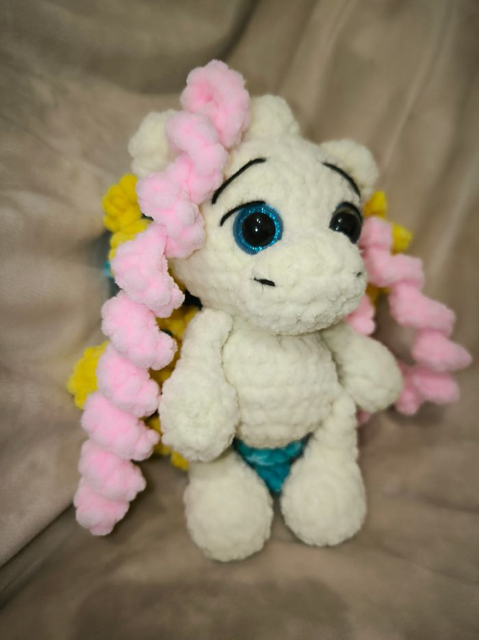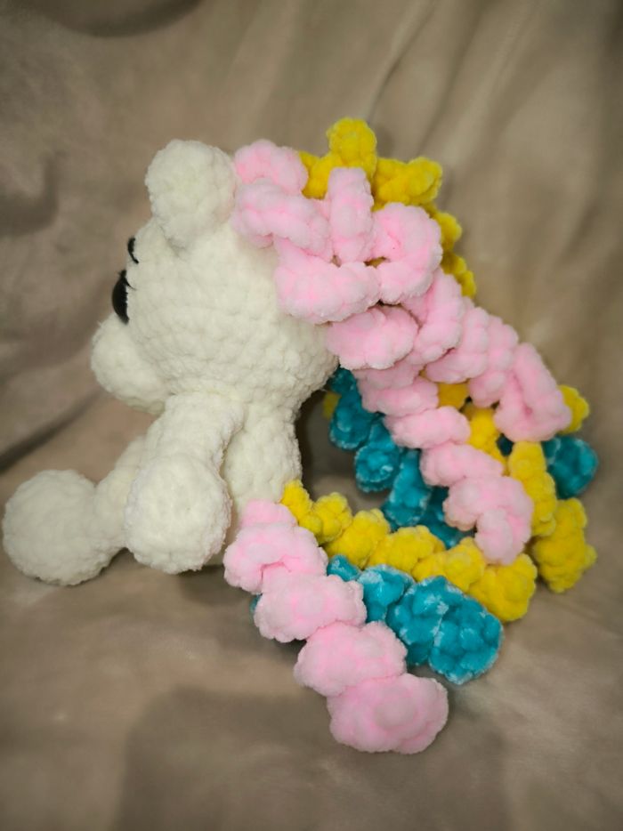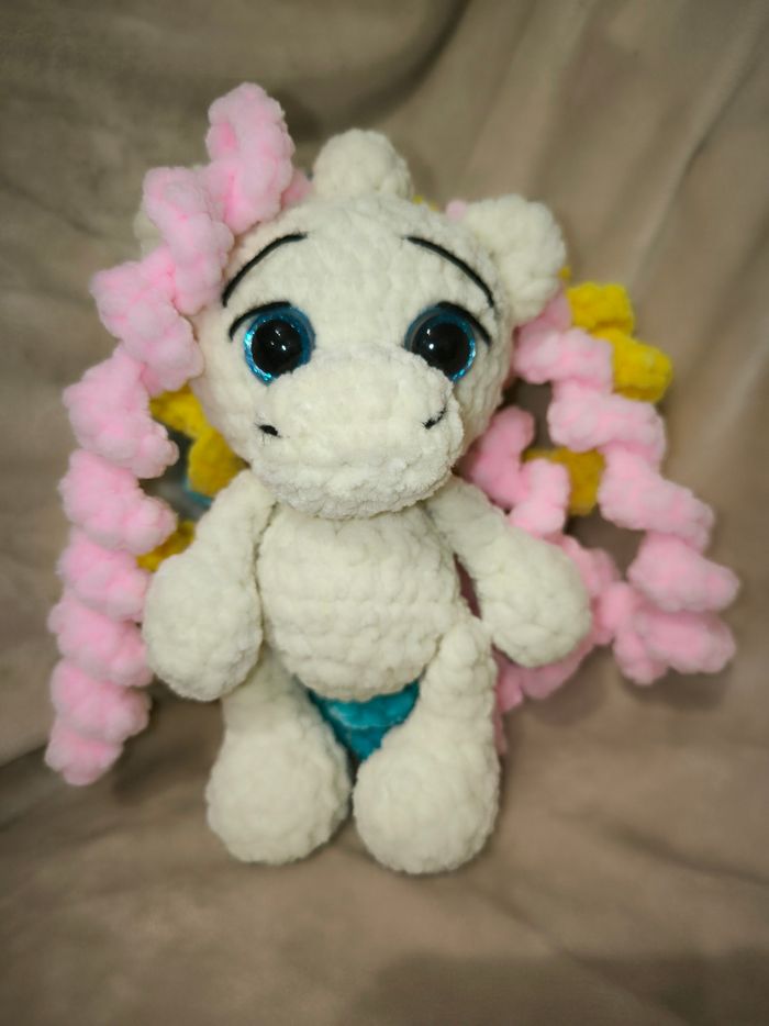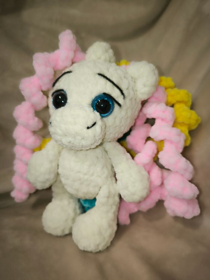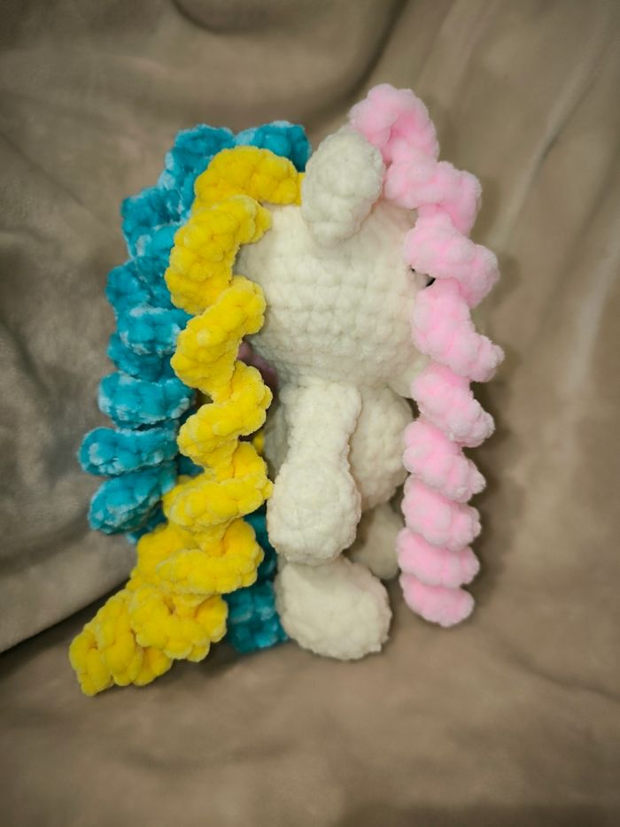 Bébé licorne au crochet réalisé à la main. Yeux sécurisés. Laine velours. Ne convient pas aux enfants de moins de 3 ans. Peut être utilisé en décoration sans problème. Il mesure environ 18cm de haut