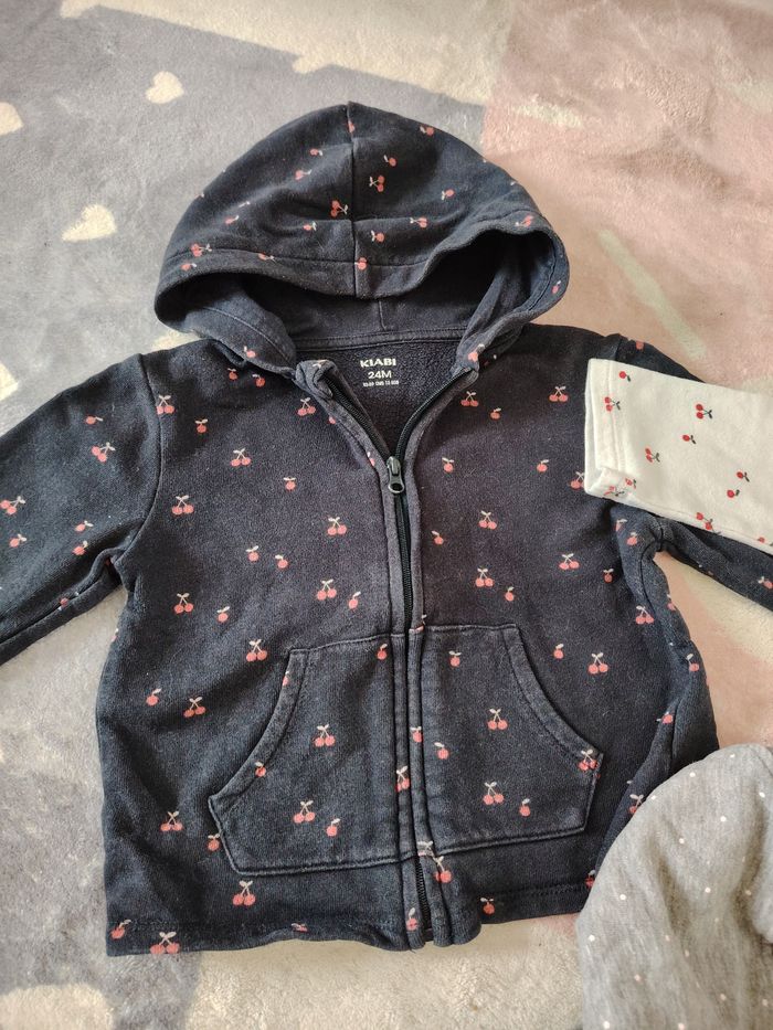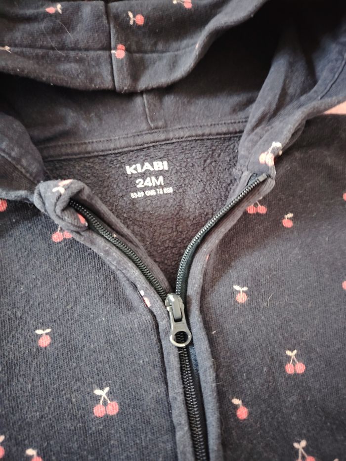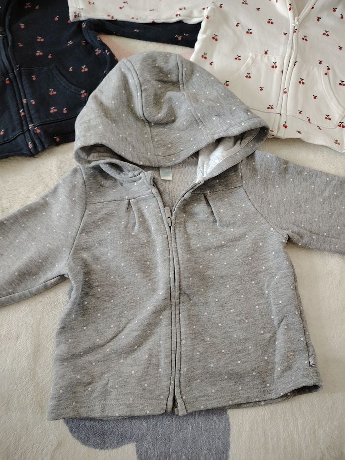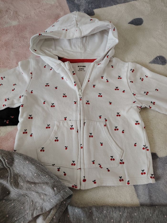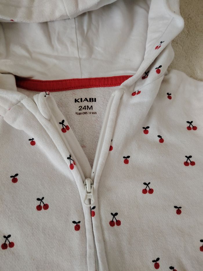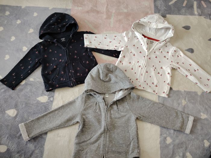 😻 Lot de 3 vestes fille 😻 Zippées et à capuches 😻 2 légèrement molletonnées et 1 légère 😻 Motifs cerises 😻 Marque Kiabi et Obaibi 😻 Taille 23 et 24 mois 😻 Très bon état général (une petite tâche sur la blanche, voir photos)