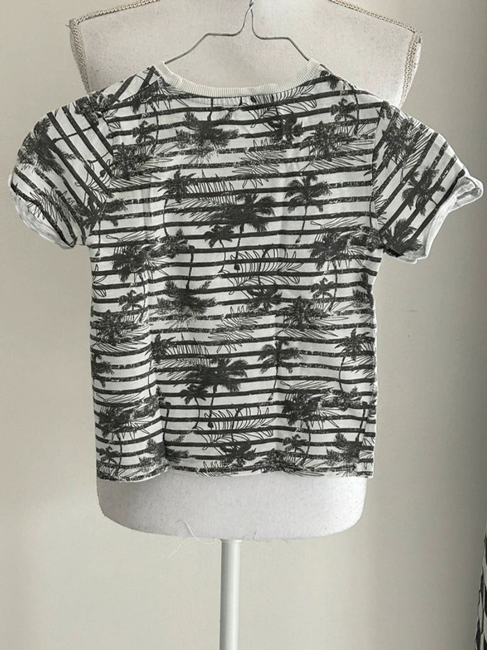Description: 👕 Tee-shirt de la marque Kiabi, taille 6 ans 🖤🌴 Couleur noir-gris à rayures avec un dessin de palmiers pour une touche estivale 🌟 En excellent état, prêt à ajouter une touche de style à la garde-robe de votre enfant #TeeShirt #Kiabi #Taille6Ans #NoirGris #Rayures #Palmiers #ModeEnfant #l19