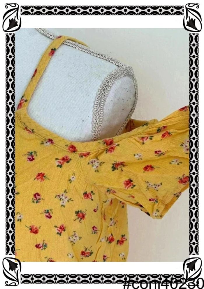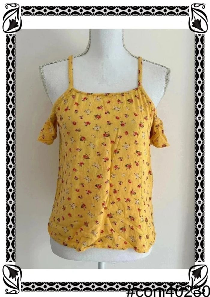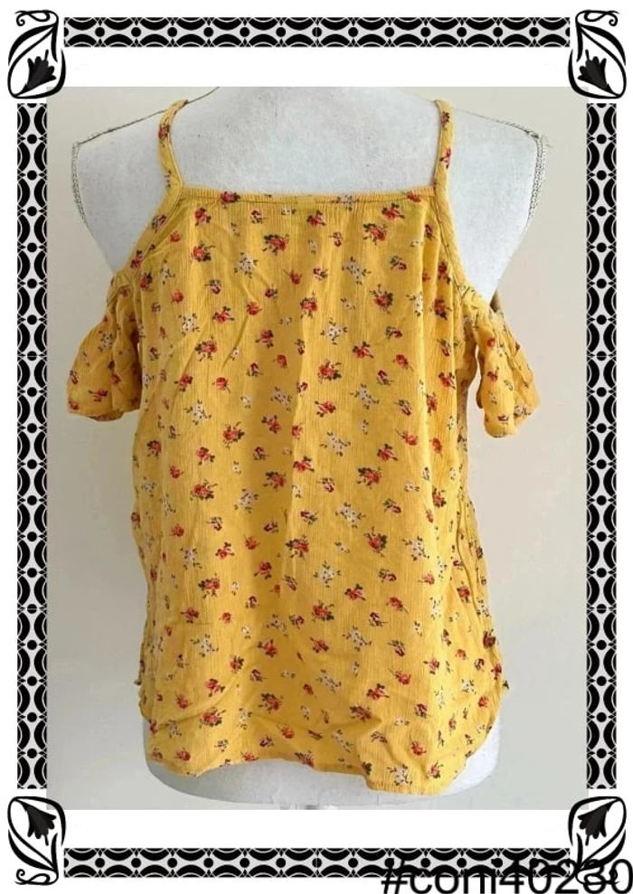Description: 👚 Top à manches courtes de chez C&A, taille 38 🌼 Couleur jaune avec un charmant imprimé de petites fleurs rouges pour une touche estivale 💫 Fines bretelles et épaules dénudées pour un look féminin et décontracté 🌟 En excellent état, prêt à égayer votre tenue avec style #TopManchesCourtes #CA #Taille38 #Jaune #ImpriméFleursRouges #ModeFéminine #Été #L16