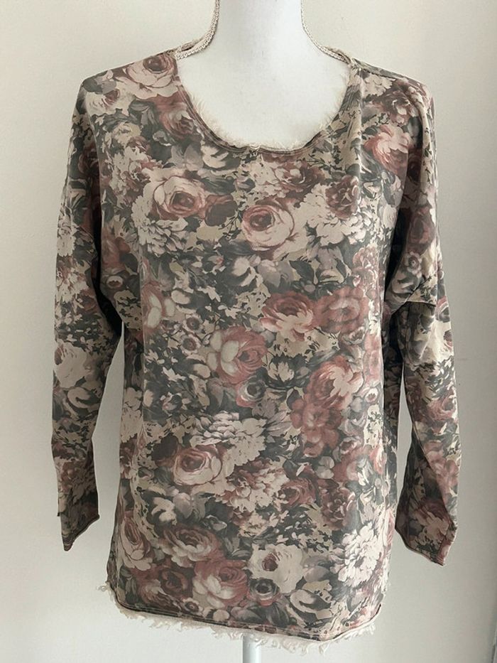 Sweat Long Beige-Kaki avec Motifs Fleurs - Fabriqué en Italie - Taille 42 - photo numéro 1