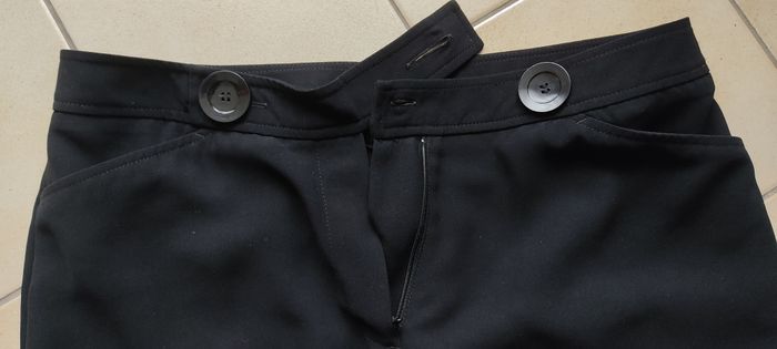 Pantalon femme de marque Emma Pernelle, très léger et facile d'entretien. Lavable machine à 30° Double boutonnage à la ceinture, 2 poches avant Bas à fente élégante Etat neuf Taille 42, 100% polyester Pour femme de moins de 1,60 m Une veste noire de même marque peut compléter pour faire un ensemble pantalon (voir mes autres annonces) Disponible à Massy, envoi possible