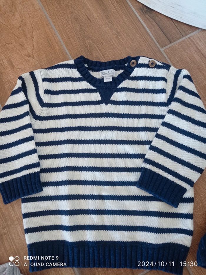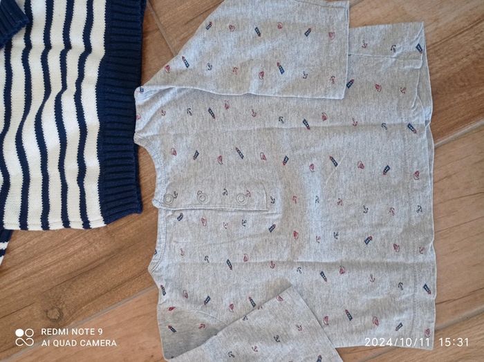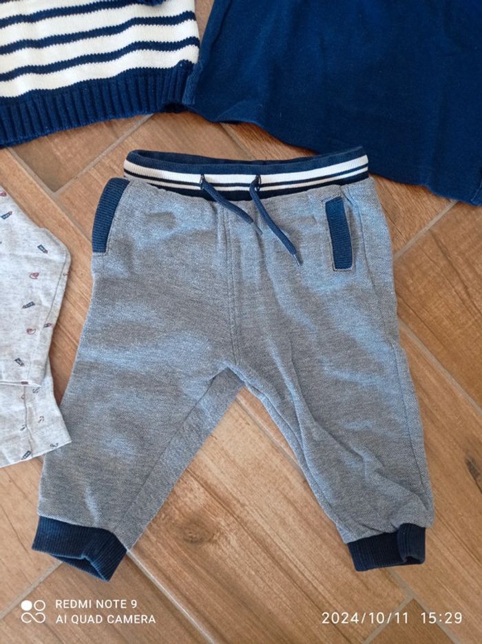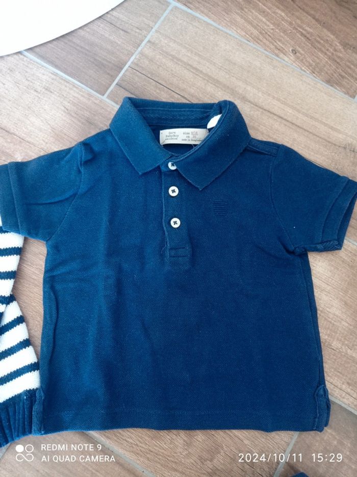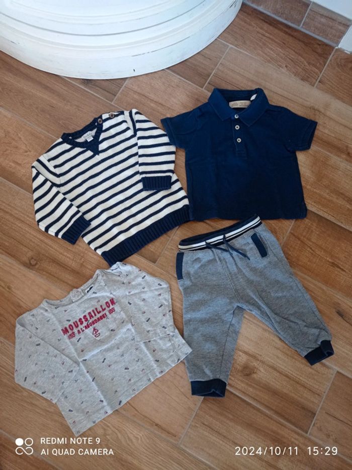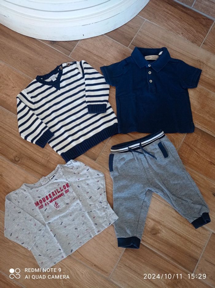 Ensemble 9/12 mois Bas jogging bleu chiné Orchestra 12 mois Polo bleu marine Zara 9/12 mois Tee shirt gris moussaillon 12 mois Pull marinière 9 mois (taille plutôt grand)
