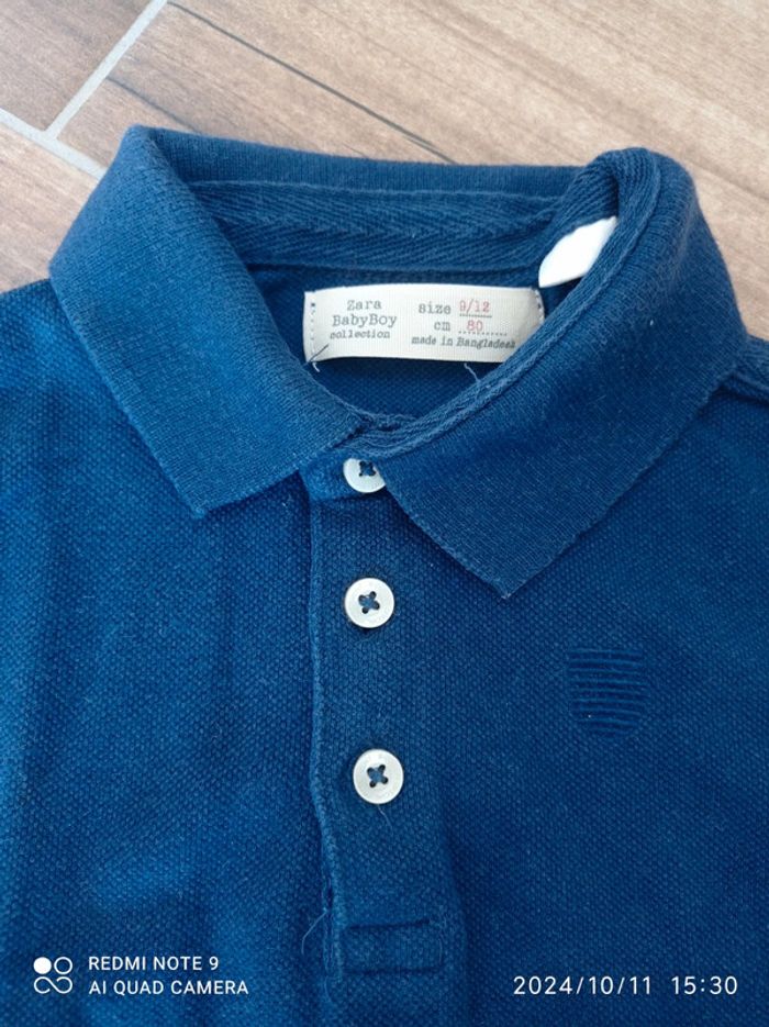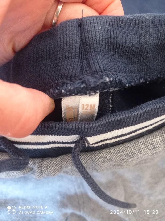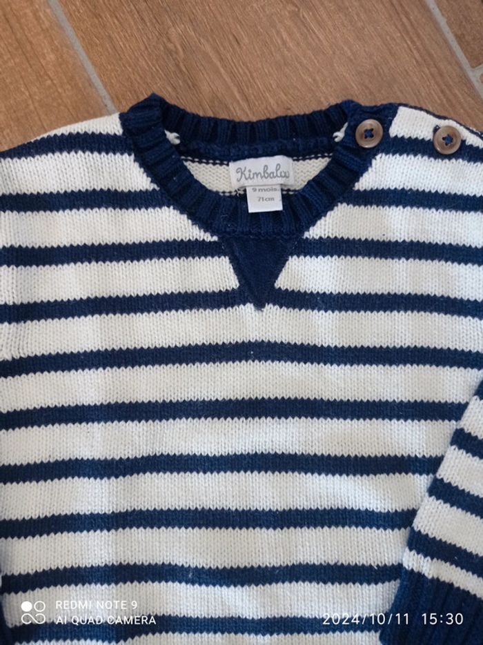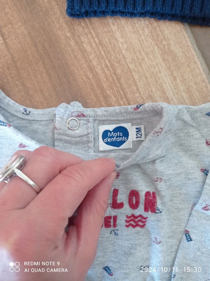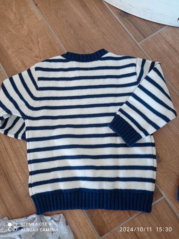 Ensemble 9/12 mois Bas jogging bleu chiné Orchestra 12 mois Polo bleu marine Zara 9/12 mois Tee shirt gris moussaillon 12 mois Pull marinière 9 mois (taille plutôt grand)