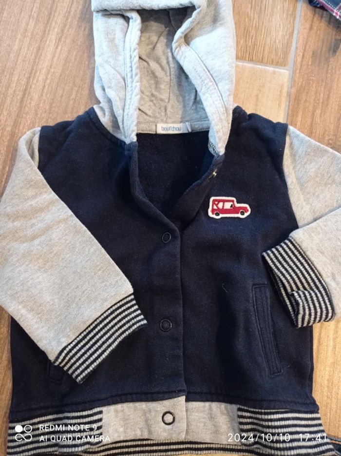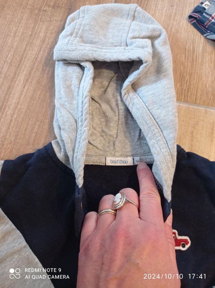 Ensemble 9 mois Jean brut Vertbaudet Tee shirt blanc Creeks Chemise a carreaux marine/blanc/ rouge Creeks Veste zippée a capuche marine et grise, broderie voiture rouge, Bout'chou