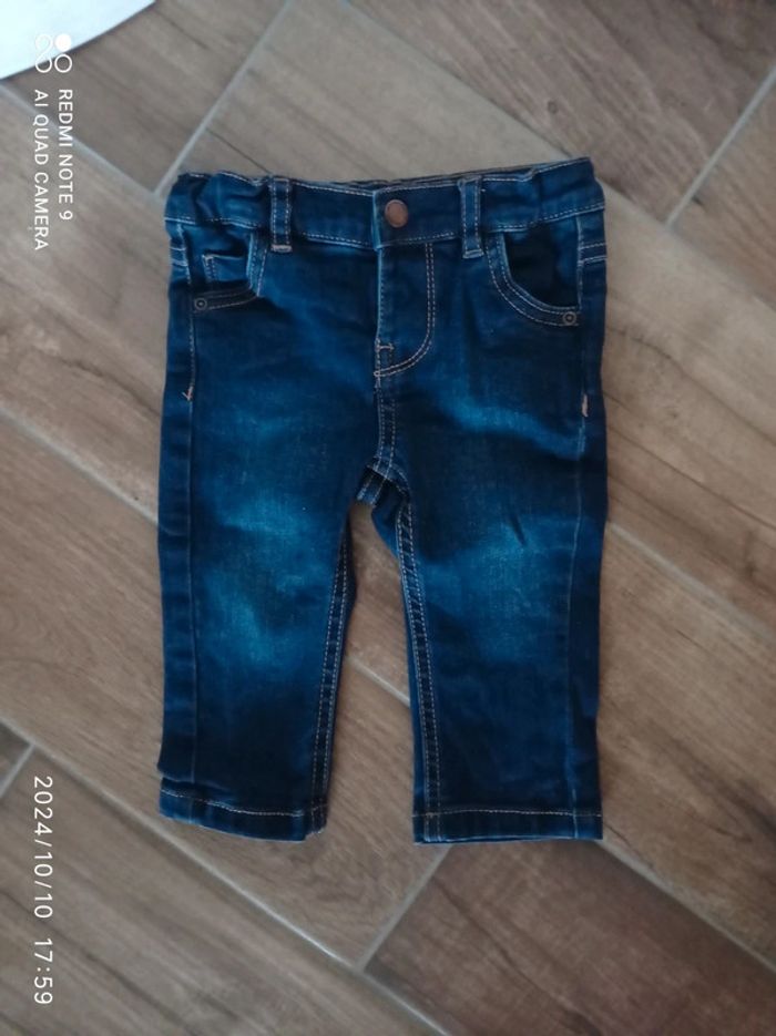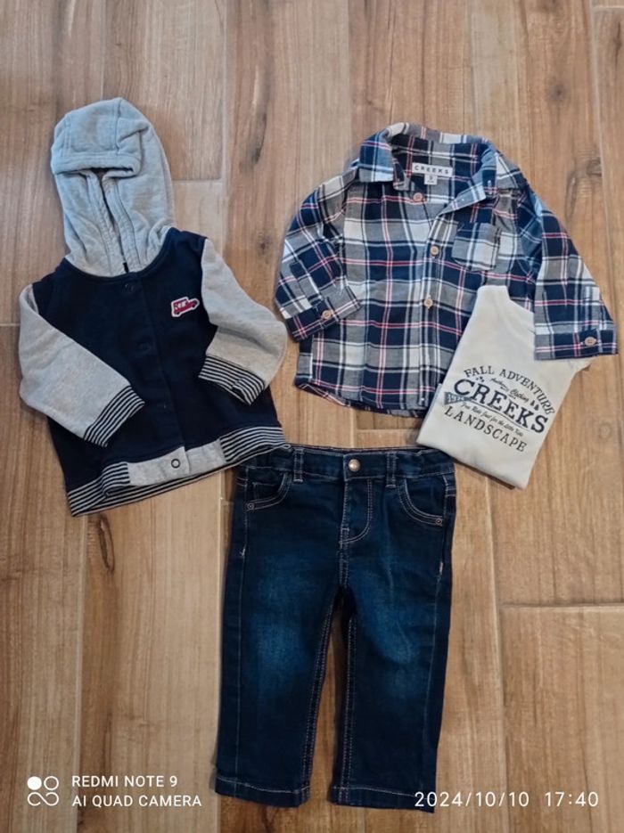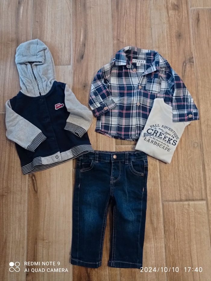Ensemble 9 mois, jean+ tee shirt blanc+ chemise carreaux+ veste sweat zippée