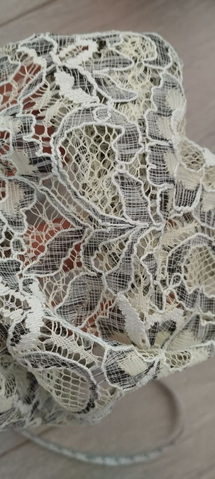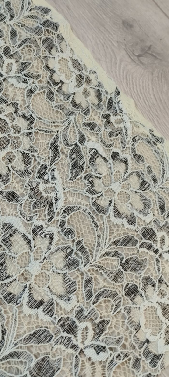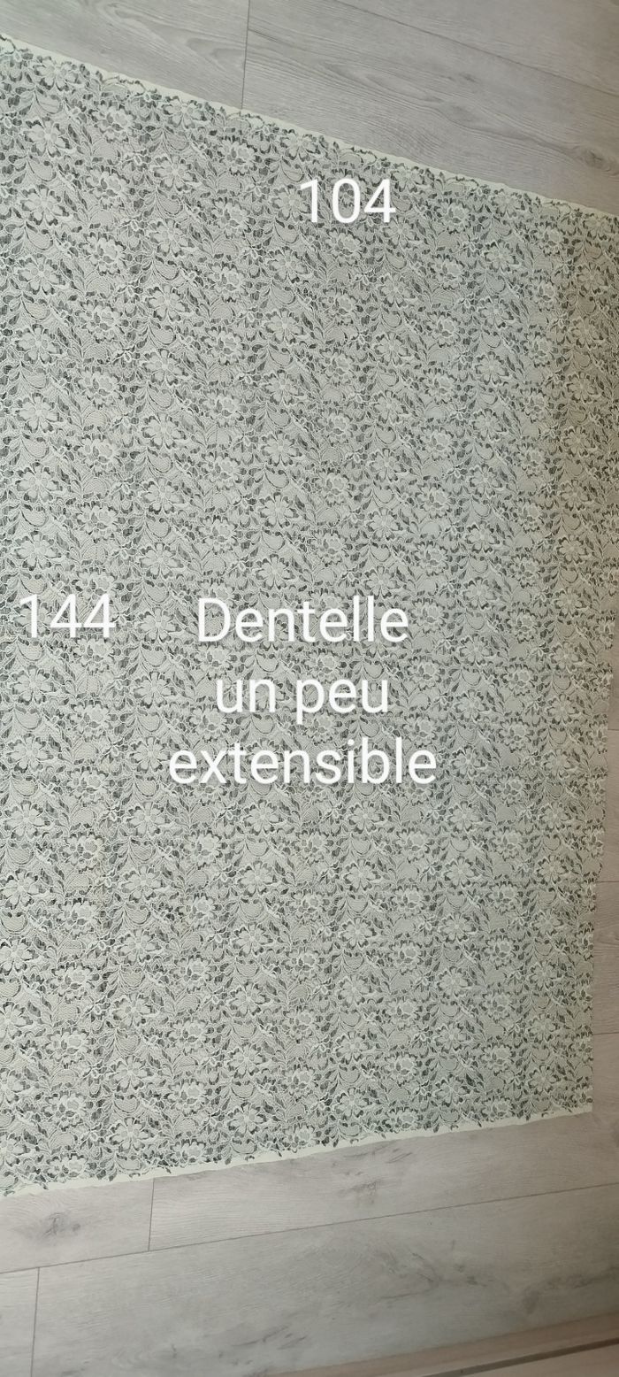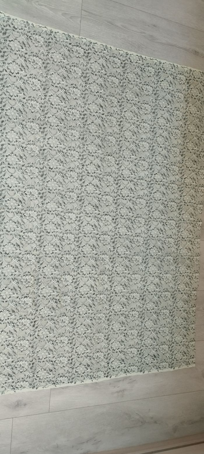 Bonjour, Je vends ce coupon de tissus en matière dentelle légèrement extensible, il est jaune pâle de chez Glitzerpüppi, voir dimensions sur la photo