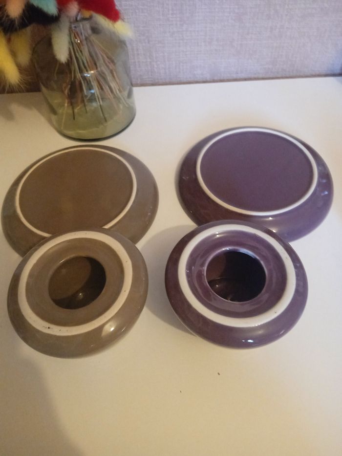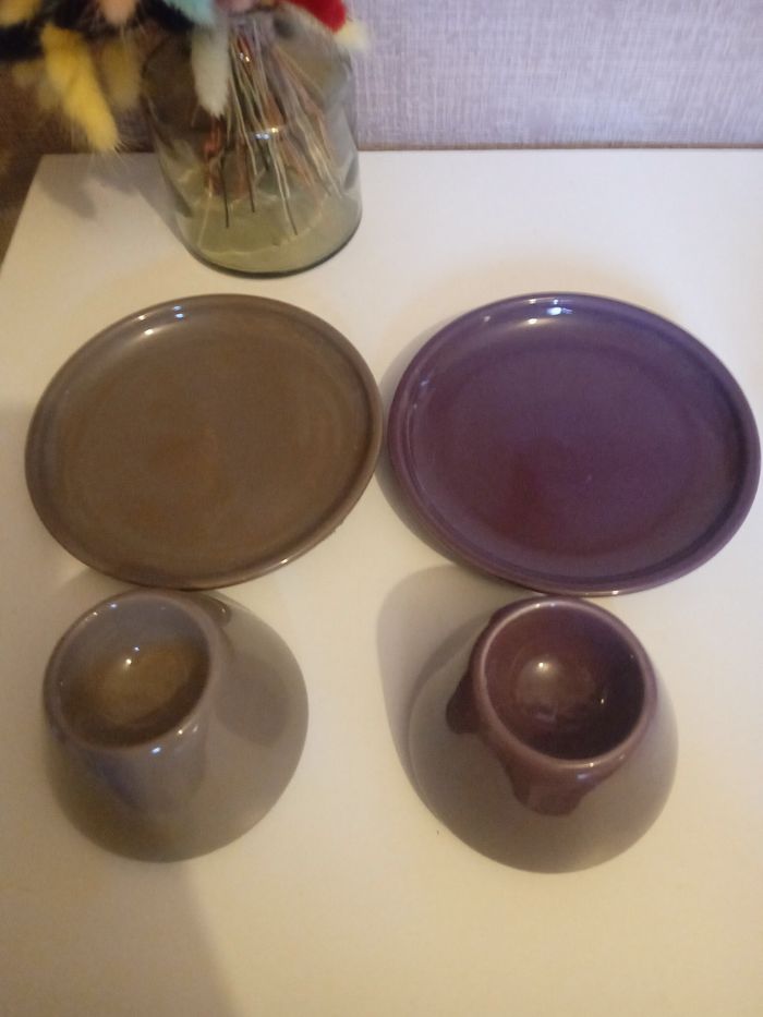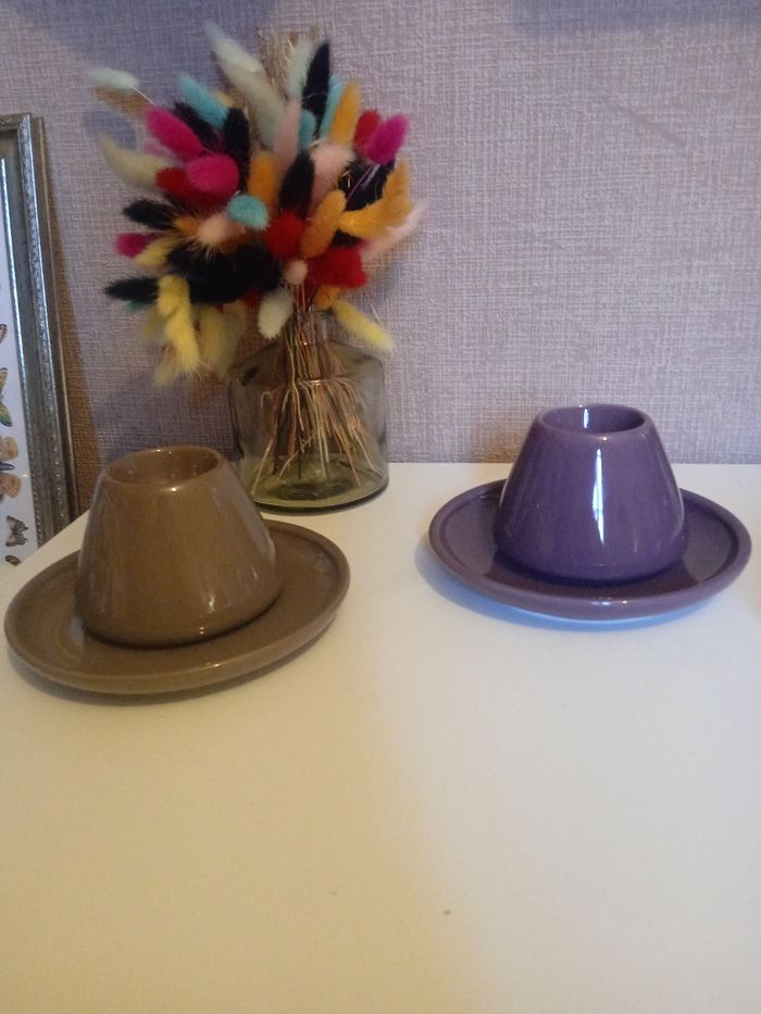 Lots 2 coquittiers avec leur assiette Violet et gris Céramiques Très bon état Prix 1.50 Les réduction sont activé sur les lots
