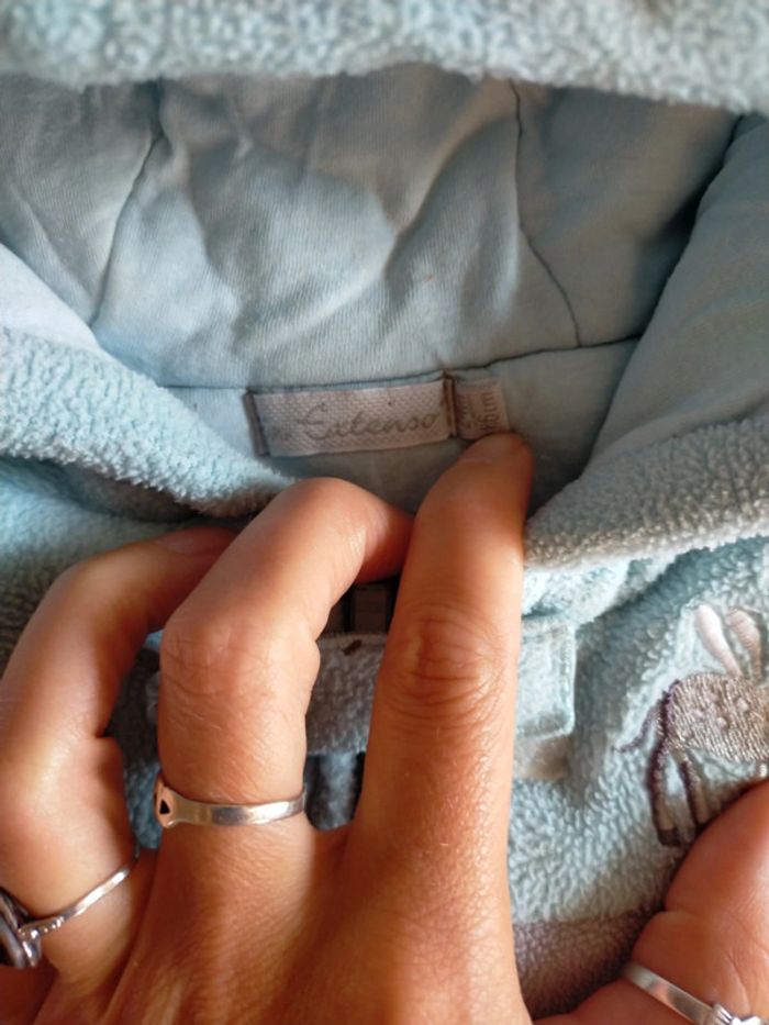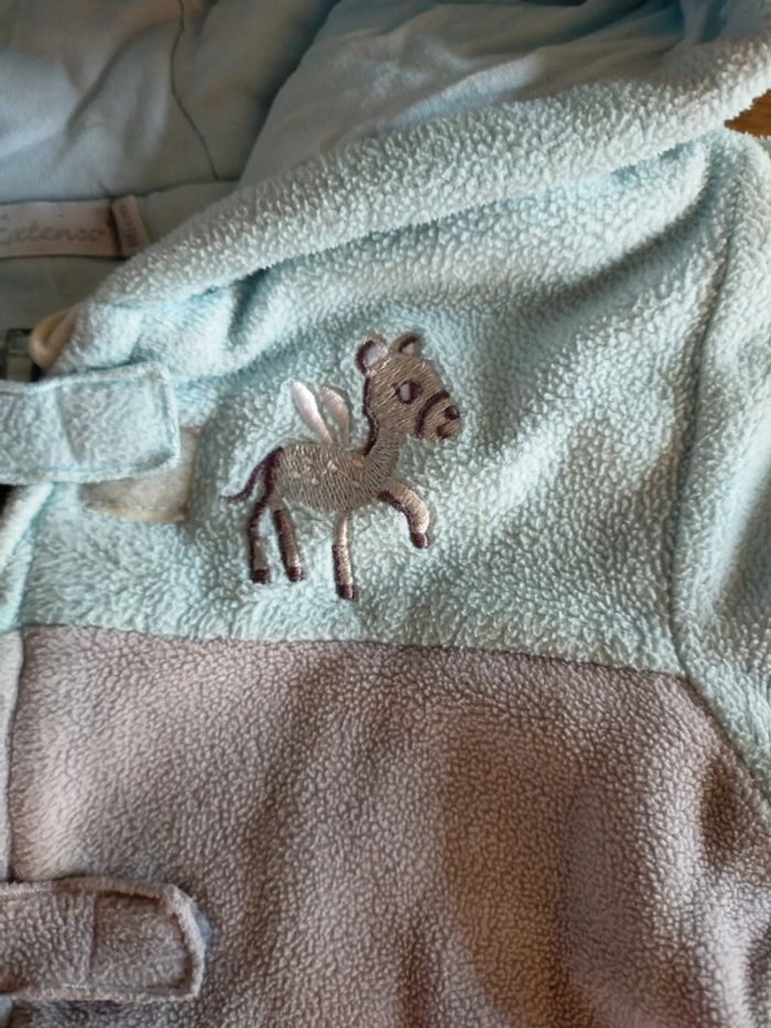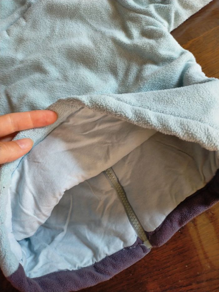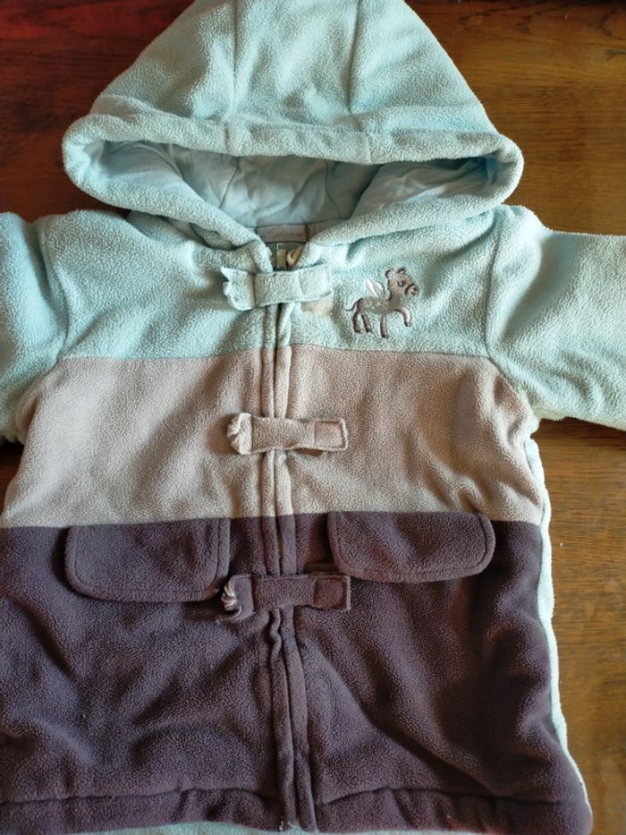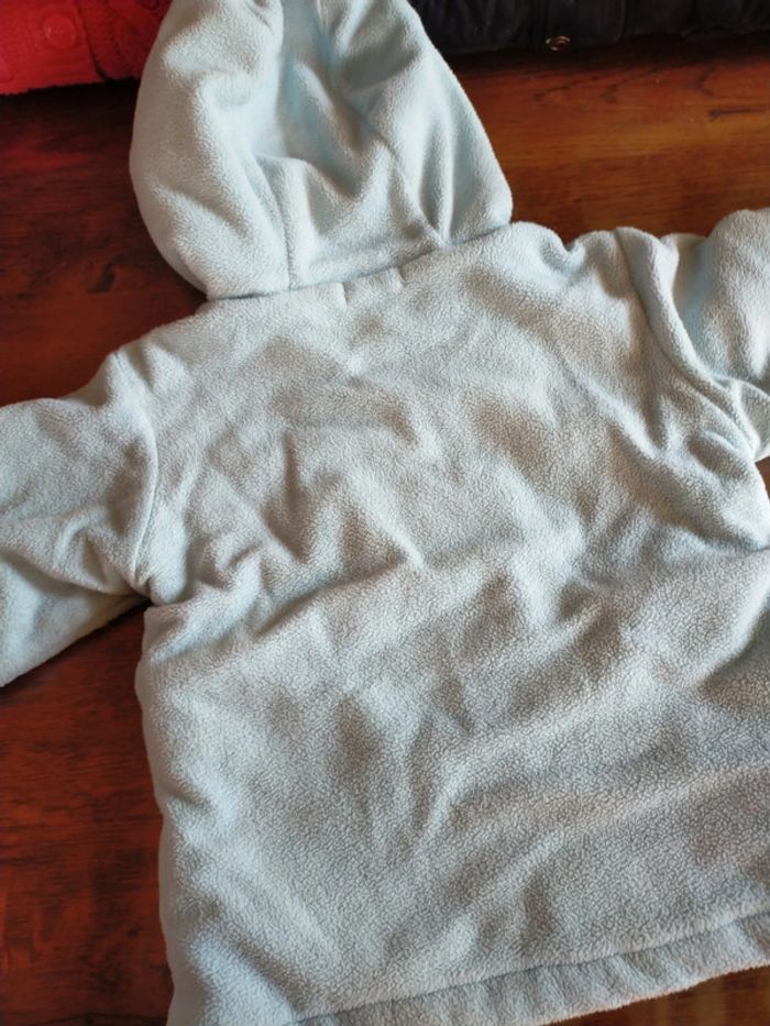 Doublée. Capuche. Zip devant. Dégradé de bleus. Très jolie et confortable. Portée, bouloches