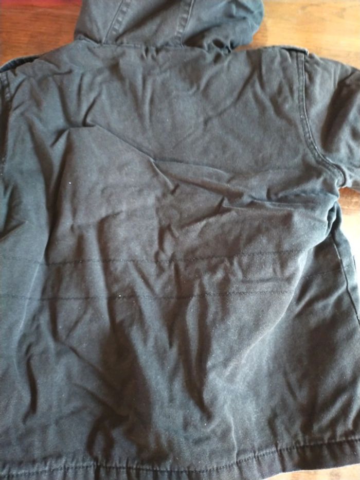Joli manteau garçon, épais à capuche. Fermeture par zip et boutons. Nombreuses poches