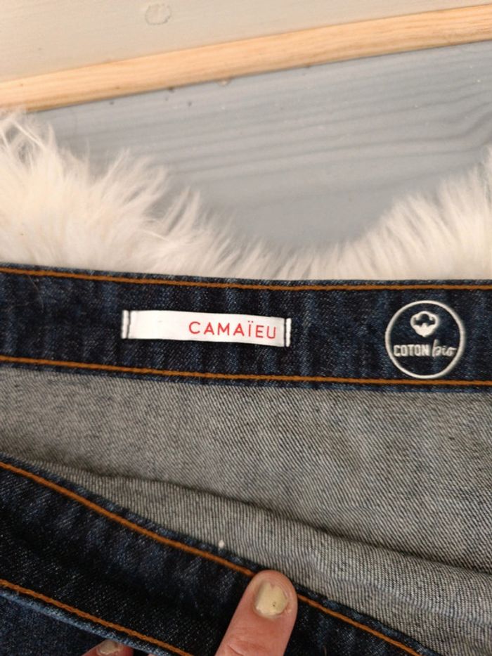 Jupe en jean style portefeuille t 42 ,( étiquette manquante), bleu denim. En coton bio, marque camaïeu
