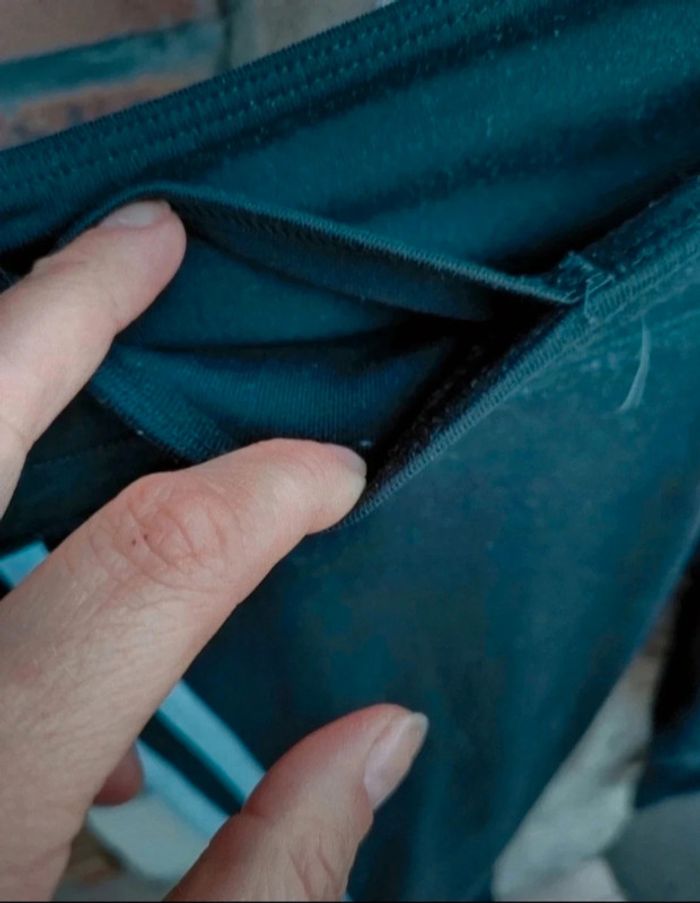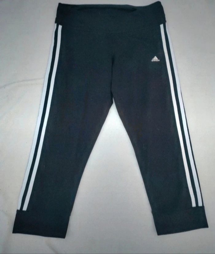 Pantacourt noir et blanc Marque : adidas Taille : S Longueur : environ 69 cm Largeur taille : 35 cm (taille élastique). Matière : 90 % polyester, 10 % elasthanne. Très légère tâche à côté du logo (voir dernière photo).