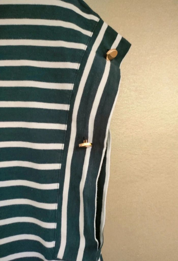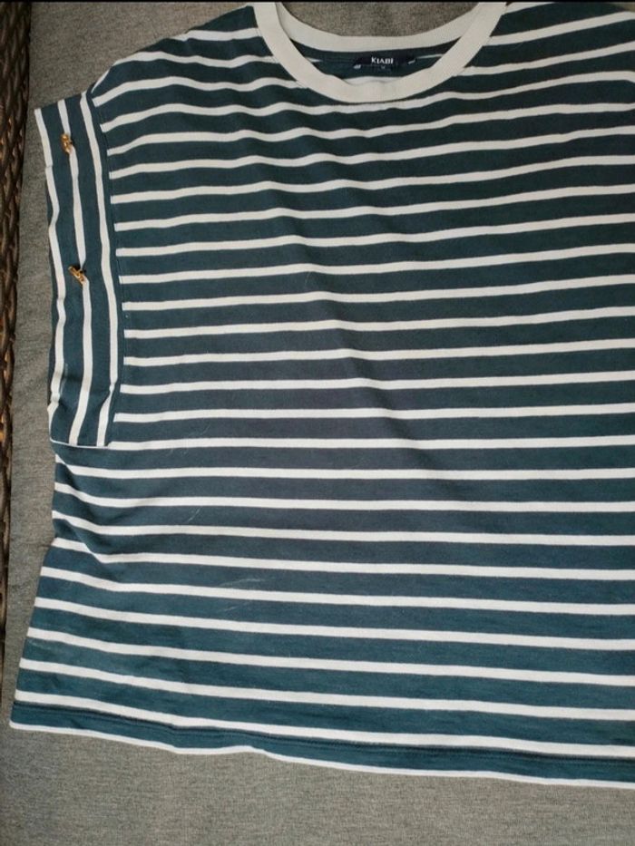 Débardeur rayé manches larges avec boutons dessus (bouge). Porté 1-2 fois. Marque : Kiabi Taille : M / EUR 38-40 Matière : 100% coton Dimension aisselle à aisselles : environ 48 cm