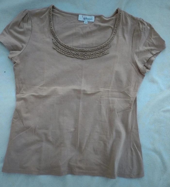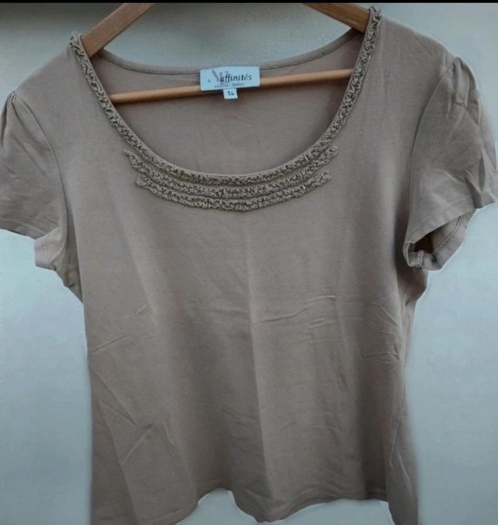 Tee-shirt marron. Petit détail sur le devant Marque : Armand Thiery. Taille : 4 (merci de vous fier à taille 4 la taille XL est à titre indicatif pas sûr que cela correspond) Dimension aisselles à aisselles environ 50 cm. Matière : 95% coton & 5% elasthanne