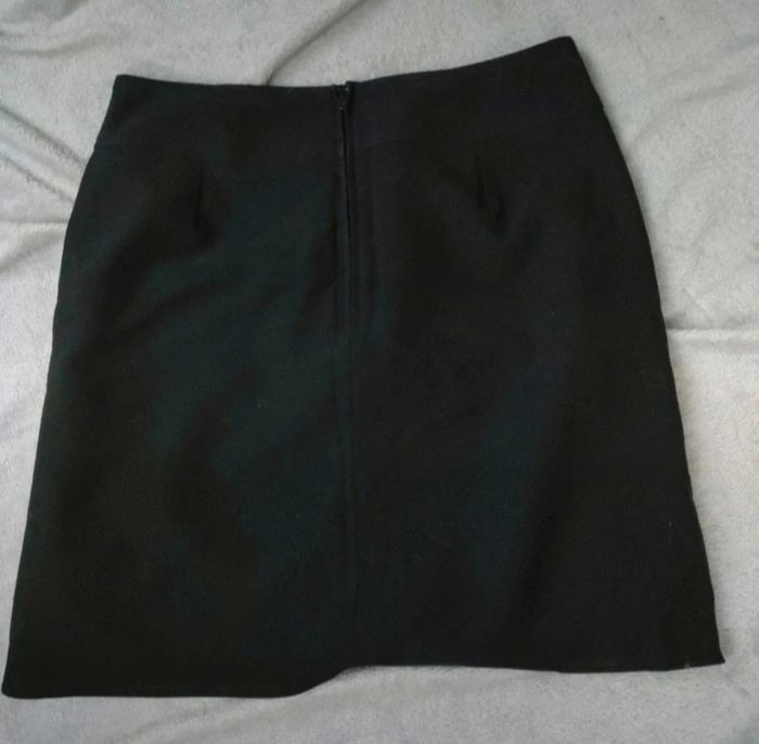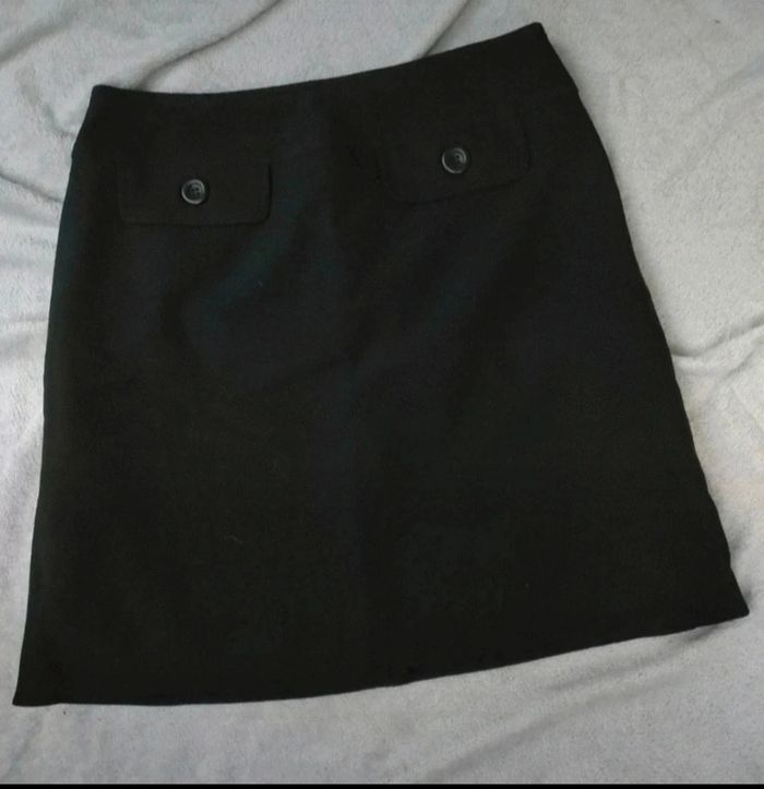 Jupe noire avec deux fausses poches devant bouton de secours. Se faire avec une fermeture éclair derrière Taille : 40 Marque : camaïeu Matière : 100% polyester Porté qu'une fois