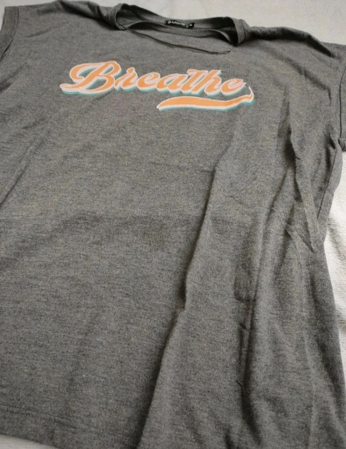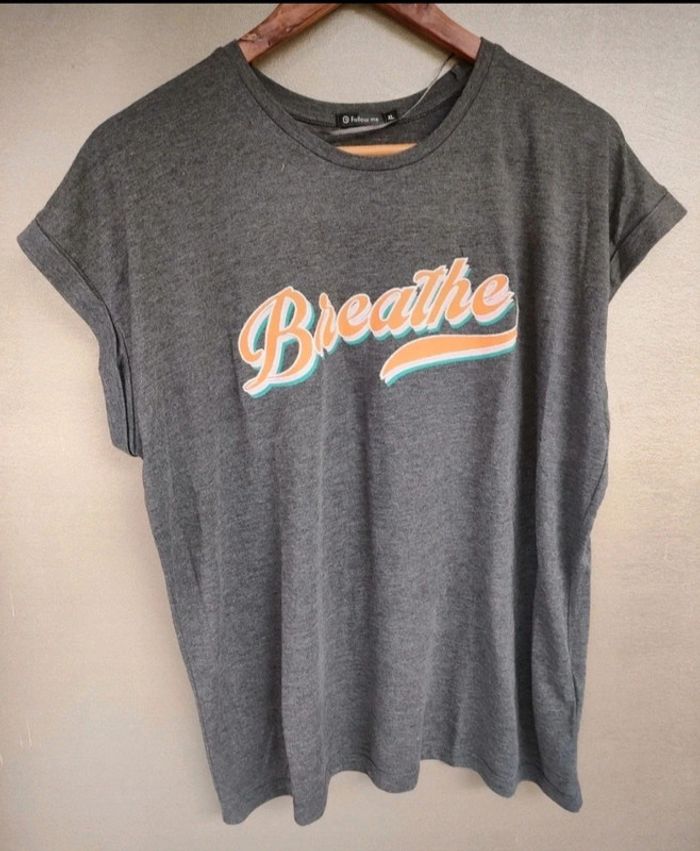 T-shirt gris manche courte et large. Écriture "breathe ' légèrement en relief. Taille : XL Marque : Gémo Matière : 69 % polyester 31 % viscose. Dimension aisselle à aisselle : 59 cm environ