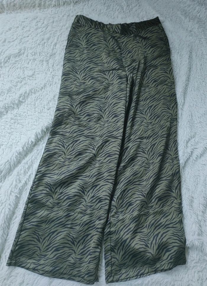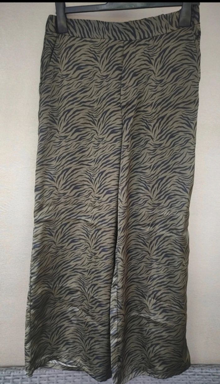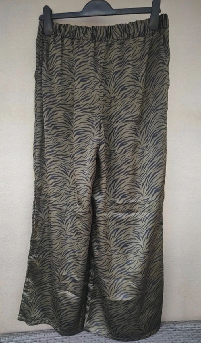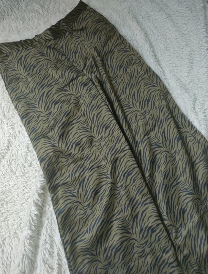 Pantalon fluide vert et noir. Élastique au niveau de la taille à l'arrière. Avec 2 poches. Très peu porté. Taille : 38 Marque : Kiabi Matière : 97 % de polyester les 3 % élasthanne