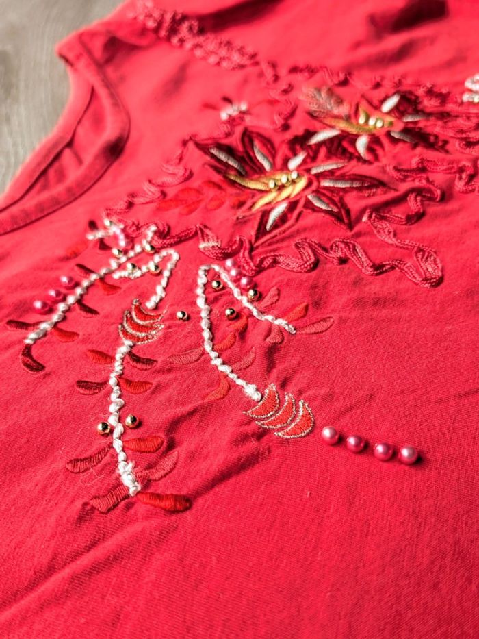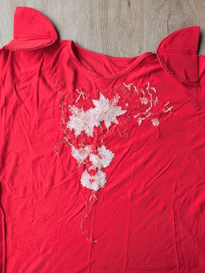 T-shirt femme rouge avec motifs brodés et perles taille L ? (Hauteur : 65 cm, largeur : 55 cm) Avec épaulettes