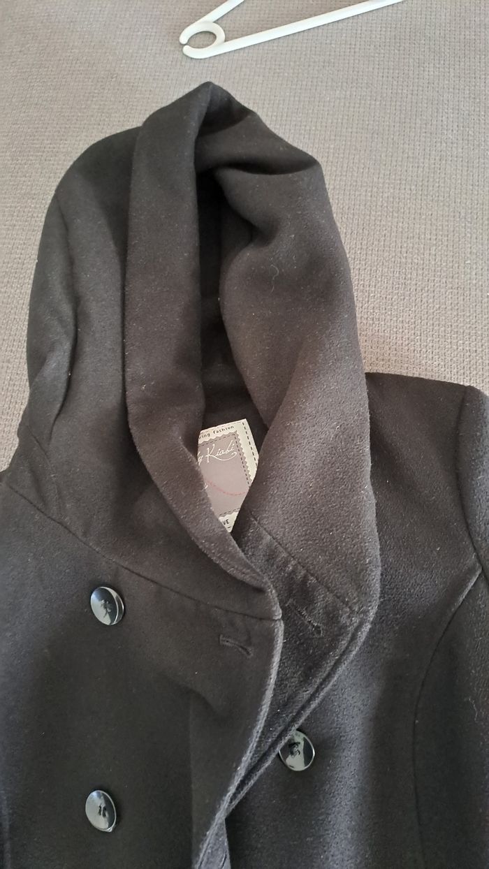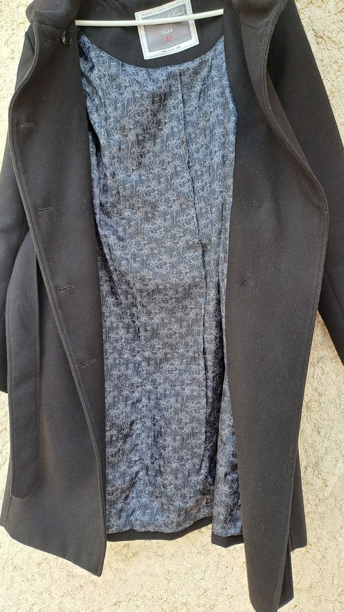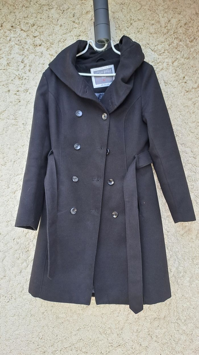 Très beau manteau en très bon etat Ceinture à la taille Grande capuche qui une fois replié fait un grand col Taille42 Largeur aisselles 53cm Doublure polyester Laine acrylique