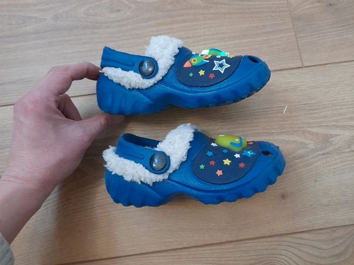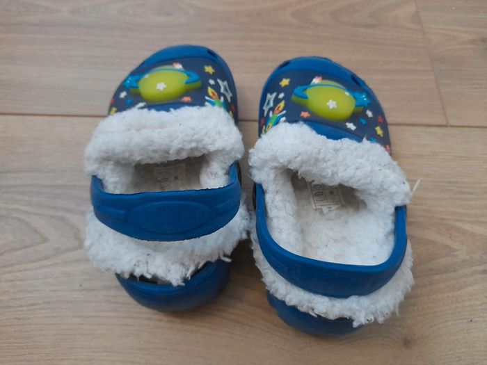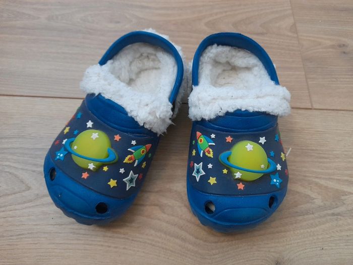 Chaussons chauds type croc´s doublés moumoute. Les lumieres des planètes s´allument et clignotent lors des "impacts". Peu portés, ils sont comme neufs. Pointure 25 mais taille petit, ira aussi pour du 24. #ce21enfants #ce21chaussures . Liste de tous mes liens bien classés dispo dans mon profil, bonne visite 😉
