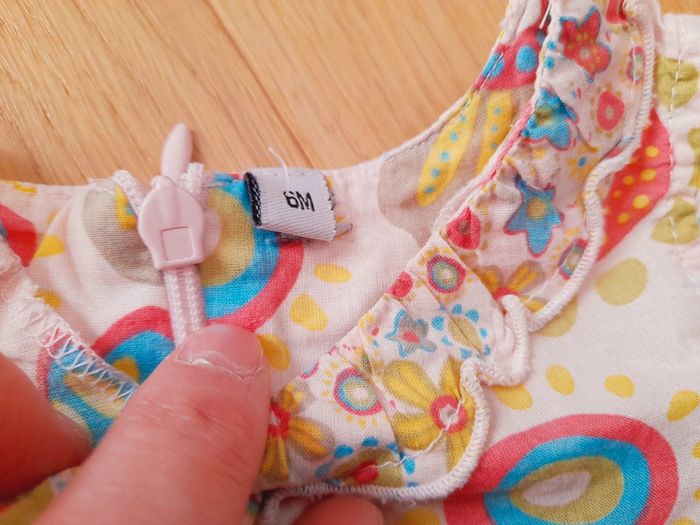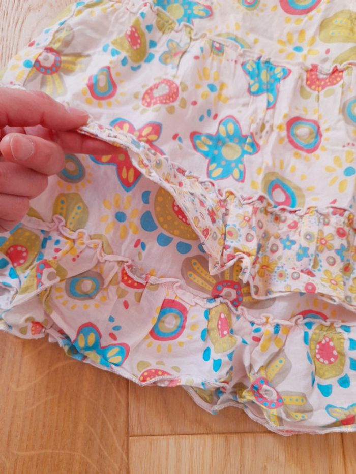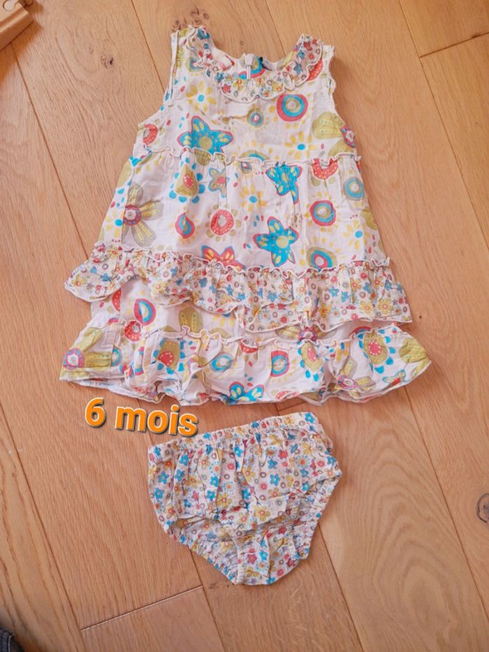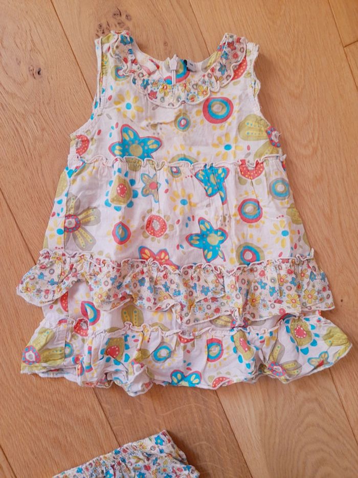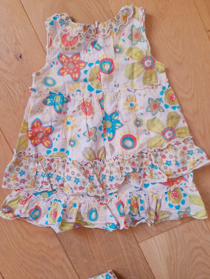 Enstmble robe été + culotte boomer, rose pâle motifs fleurs bleues vertes rouges, petits volants, sans manches. Fermeture éclair au dos. Couleurs un peu passées. #ce21bébé #ce21_6mois . Liste de tous mes liens bien classés dispo dans mon profil, bonne visite 😉