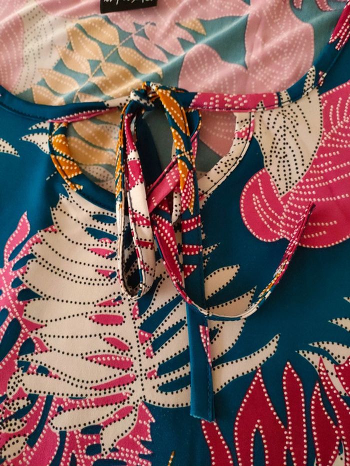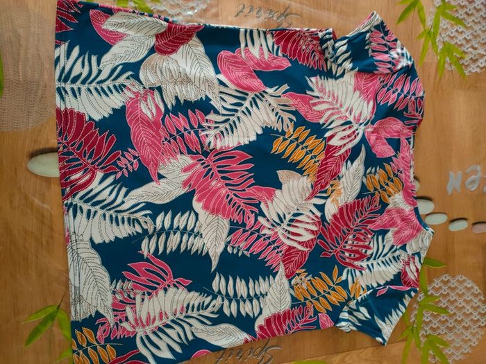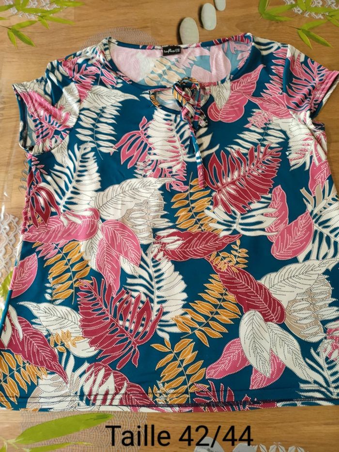 Tissu extensible, manches courtes, largeur aisselles 49 cm, petits points en relief