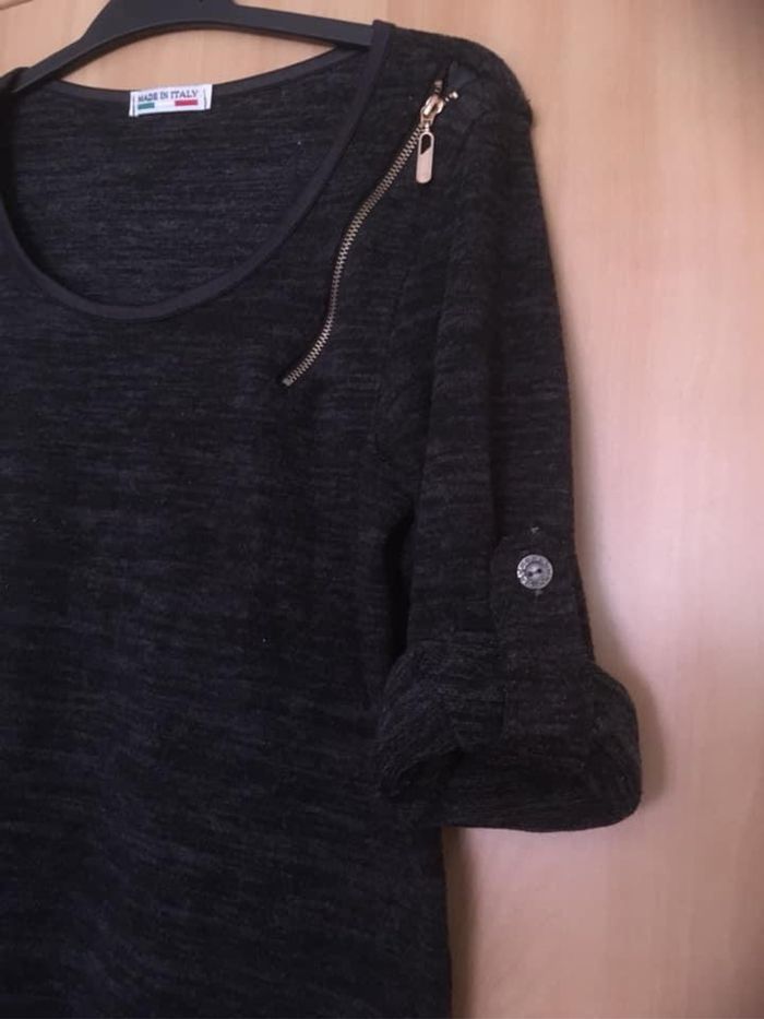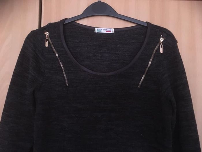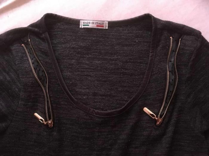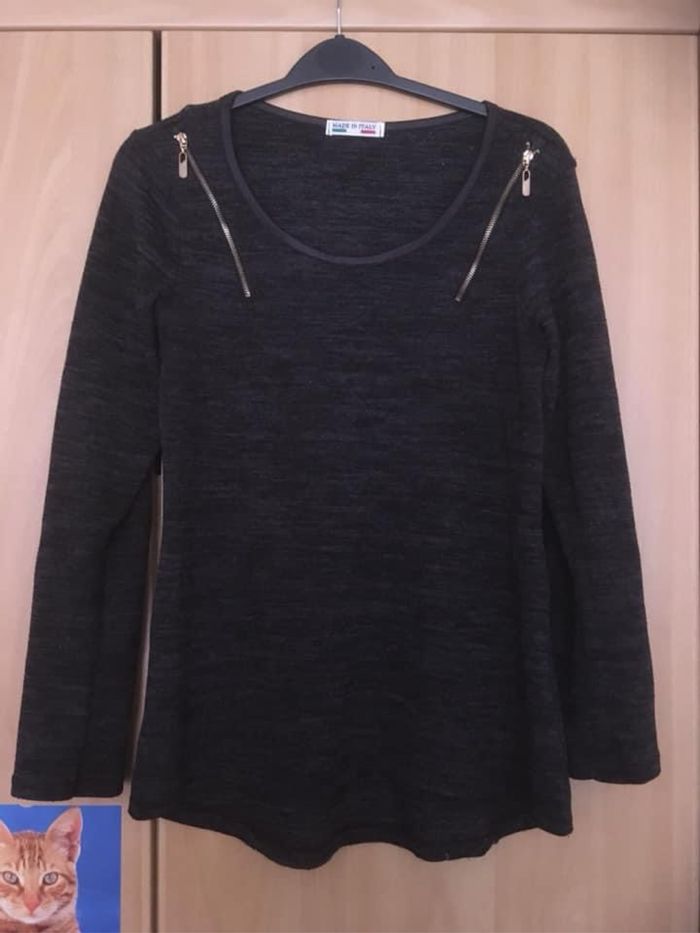 Haut ML Taille Unique avec manches réglables selon l’envie du moment !! Coloris gris foncé et noir ~ Fermetures éclair fantaisie (voir photo) ~ Convient sans problème pour du S/M ~ 95% Acrylique / 5% Elasthanne ~ Qlqes bouloches mais rien de choquant ~ Vendu 3€.