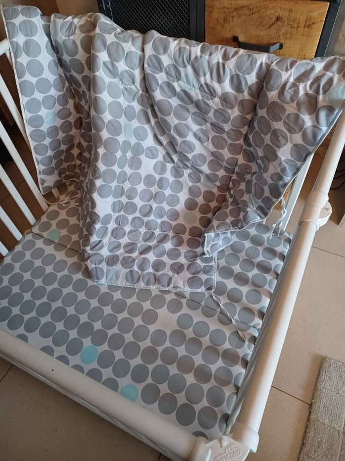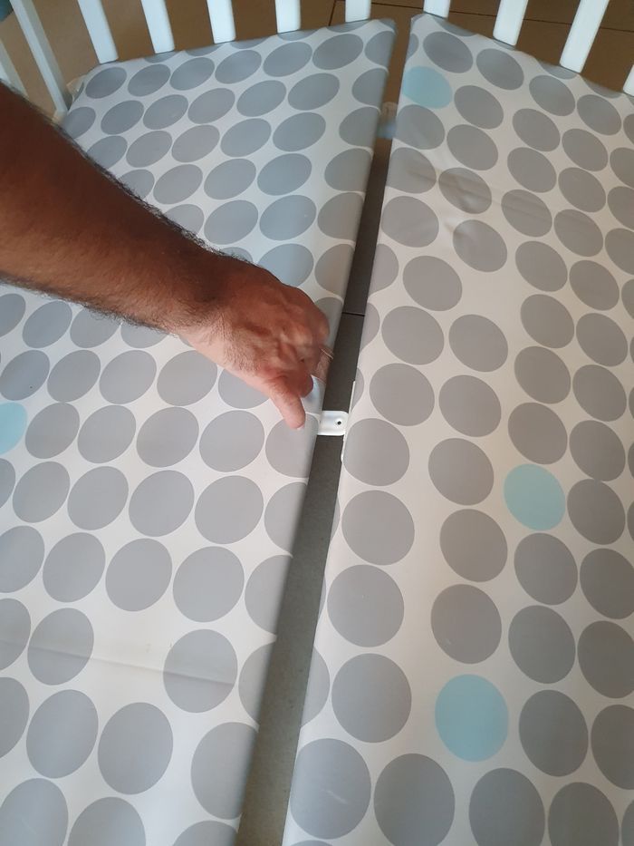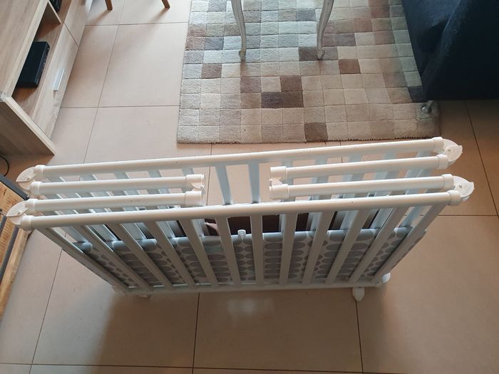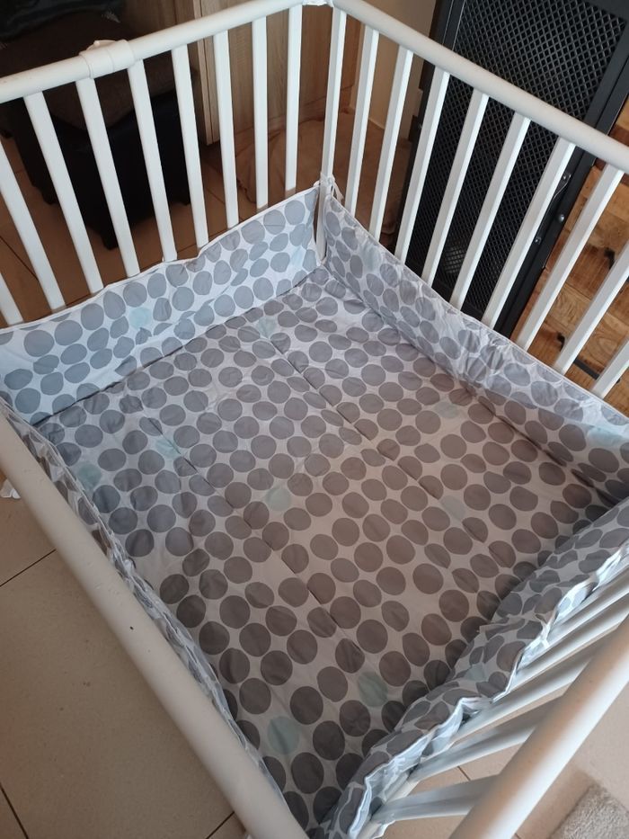 Vends parc AMELI pliable pour bébé de marque GEUTHER, dimensions 106,5x90x75 cm (dimensions intérieur 101x85 cm, dimensions plié 106,5x25x75 cm), en hêtre massif blanc, pliage facile, fond de parc matelassé lavable, thème pois gris, réglable sur 2 hauteurs, utilisable jusqu'à 15kg de l'enfant, avec 4 roulettes avec freins (roulement un peu dur). En très bon état, très propre, légèrement rongé sur le tour :-) (voir photos ci-joint). Vendu avec tapis intérieur AMELI de marque GEUTHER, thème pois gris (comme le parc), matière coton, à attacher au parc avec des ficelles, très bon état, très propre. Prix d'achat d'origine : 170€, prix de vente : 59€ (parc + tapis intérieur)