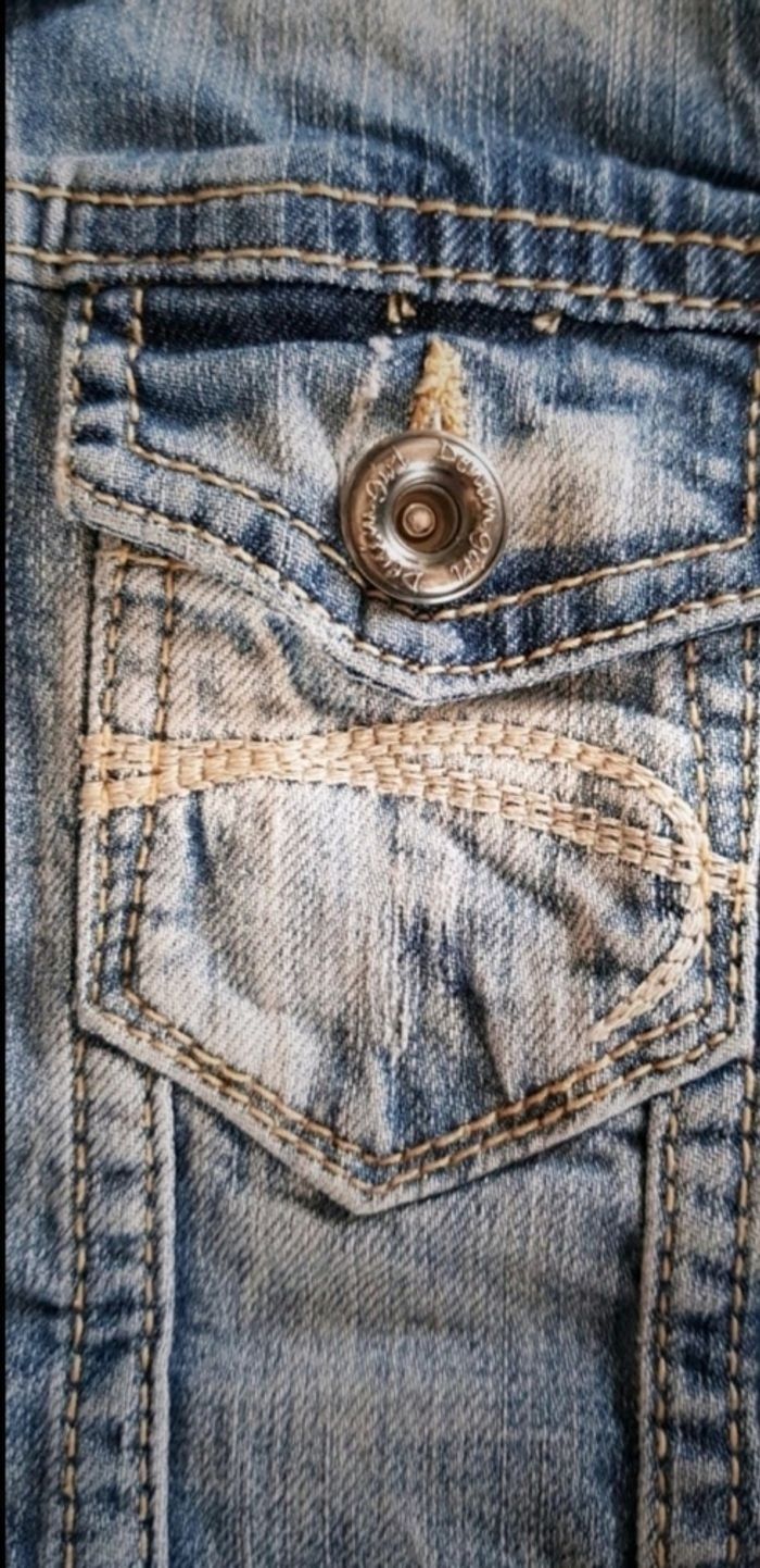 Veste en jean bleu effet blanchi a certains endroits. Peu portée