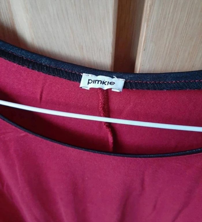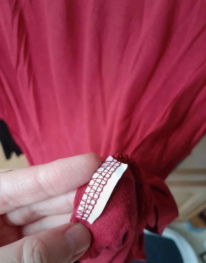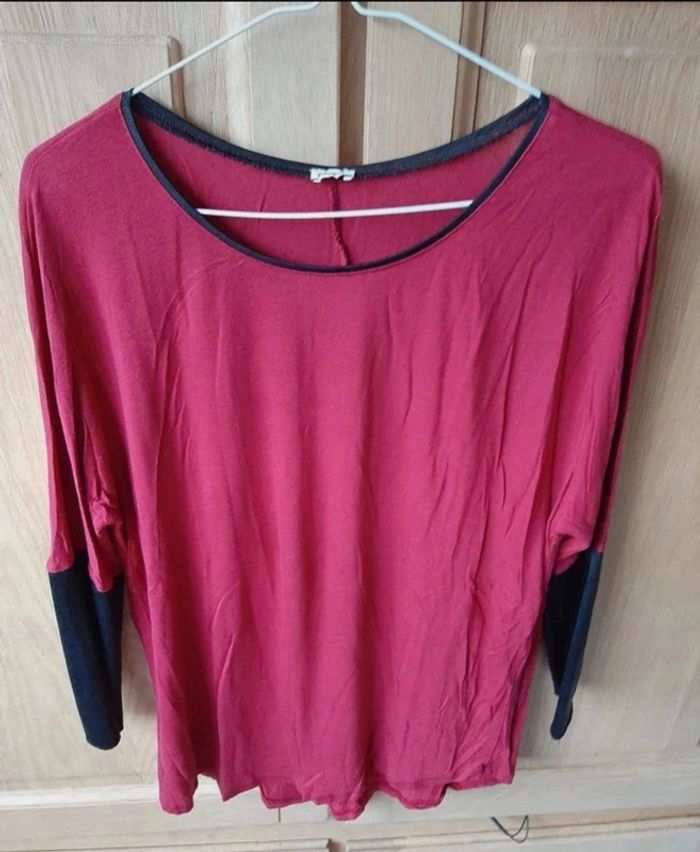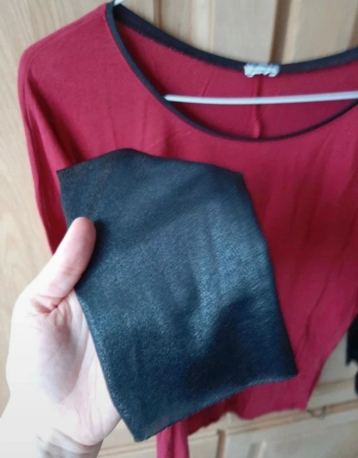 Jolie petite blouse, petit haut manches 3/4 avec le bout en similicuir noir. Couleur bordeaux. Peu porté, en très bon état. Taille S/M (étiquette coupée). Je la vends au prix de 7 euros. #TailleS36marine #TailleM38marine