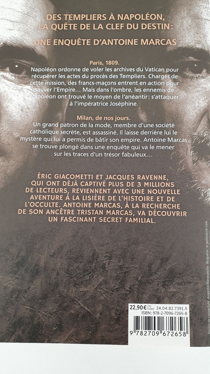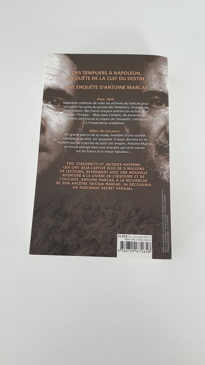 De Giacometti Ravenne Livre en très bon état Antoine Marcas se confronte aux secrets les plus sombres de ses ancêtres DES TEMPLIERS À NAPOLÉON, LA QUÊTE DE LA CLEF DU DESTIN : UNE ENQUÊTE D’ANTOINE MARCAS Paris, 1809. Napoléon ordonne de voler les archives du Vatican pour récupérer les actes du procès des Templiers. Chargés de cette mission, des francs-maçons entrent en action pour sauver l’Empire… Mais dans l’ombre, les ennemis de Napoléon ont trouvé le moyen de l’anéantir : s’attaquer à l’impératrice Joséphine. Milan, de nos jours. Un grand patron de la mode, membre d’une société catholique secrète, est assassiné. Il laisse derrière lui le mystère qui lui a permis de bâtir son empire. Antoine Marcas se trouve plongé dans une enquête qui va le mener sur les traces d’un trésor fabuleux…