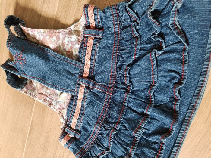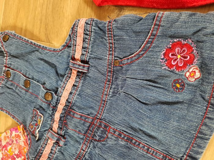 Robe-salopette courte en jean bleu foncé avec volants au dos + gilet orange (coton/polyamide/viscose) +blouse à manches courtes fleurie +bodie manches longues rouge +collant assortis très bon état