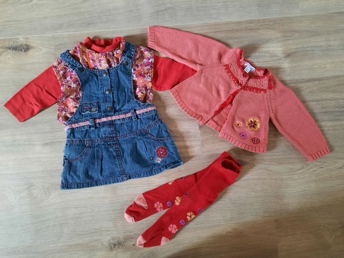 Ensemble 5 pièces: robe jean + bodie +blouse +gilet orange/fleuri +collant Orchestra 12 mois - photo numéro 2