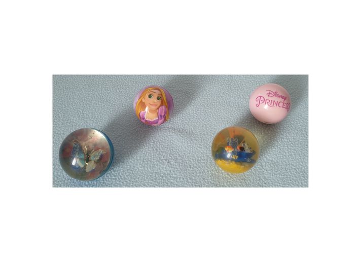 Lot balles. Lot composé de : - 2 petites balles Princesse de 3,8 cm de diamètre - 1 balle rebondissante motif papillon de 4,6 cm de diamètre - 1 balle rebondissante motif corail et poissons de 4 cm de diamètre En bon état. Sans marque. 1,50€ le lot. #vero38110enfantsdivers