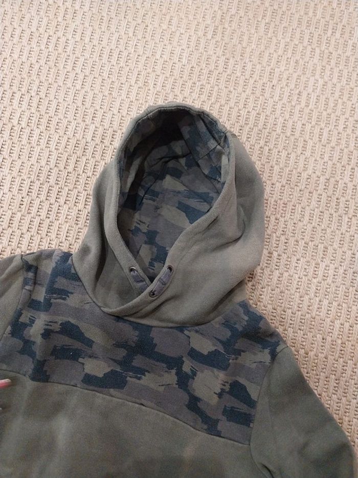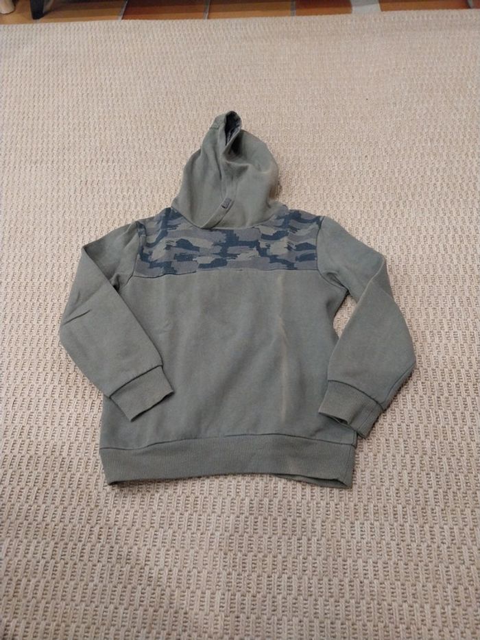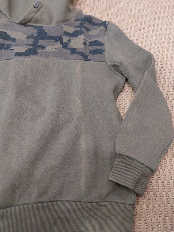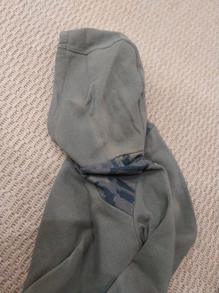 Pull sweat à capuche kaki Kiabi 10 ans Très bon état mais une ligne "décolorée " sur la pliure devant et au niveau du côté de la capuche car stocké dans une caisse transparente devant une fenêtre