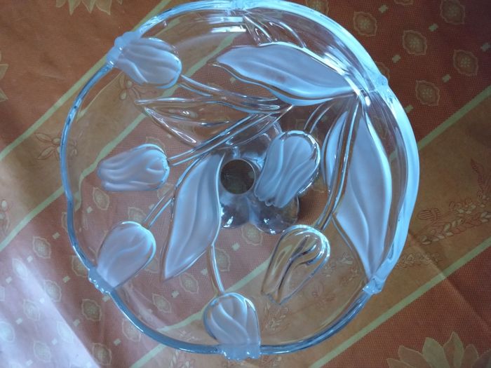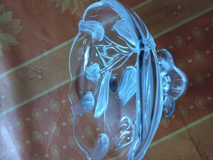 Jolie petite Coupe en Verre (Compotier?) Dimensions: Hauteur totale 11cm - Hauteur du pied 6,5cm - Diamètre 18cm Couleur: Transparent avec motifs blanchis Très élégante Coupe en parfait état, vendue comme sur les photos