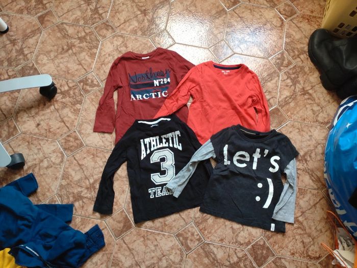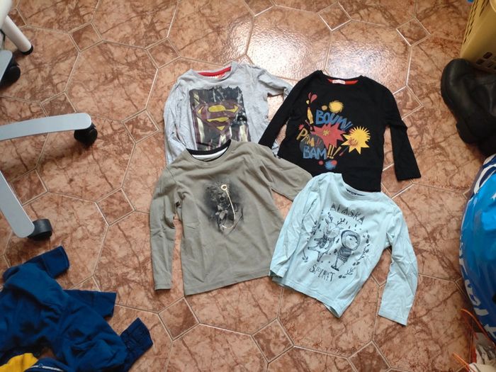 1 t shirt Primark 2 vestes zippée à capuche ( Kiabi, tao) 8 hauts légers manches longues ( superman, influx, tex, Sergent major, 2 dpam, tao, Kiabi) Le tout en bon état
