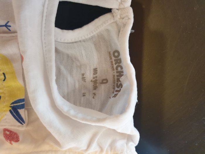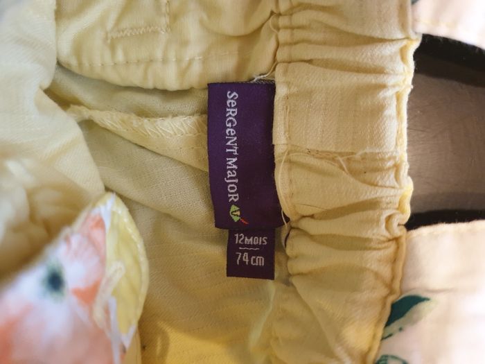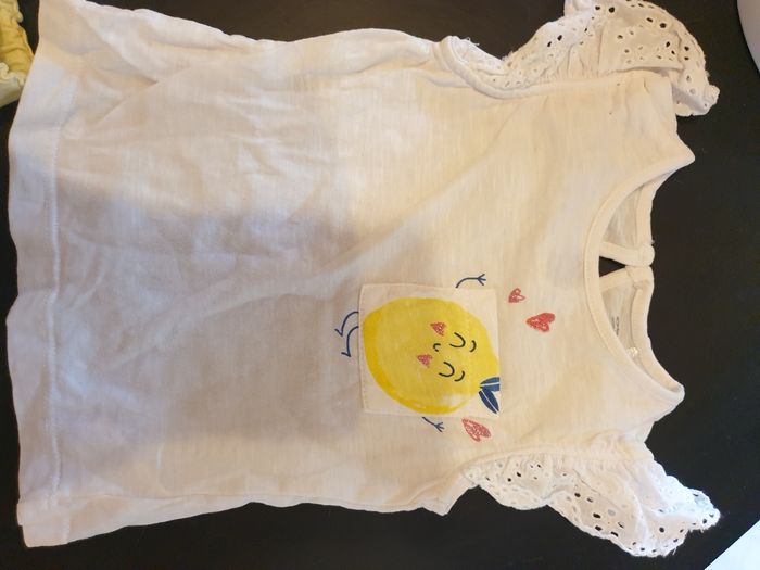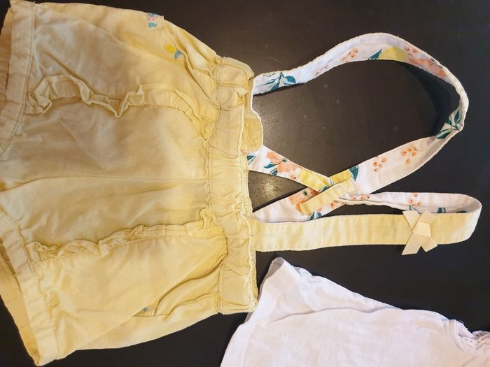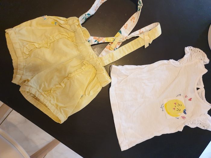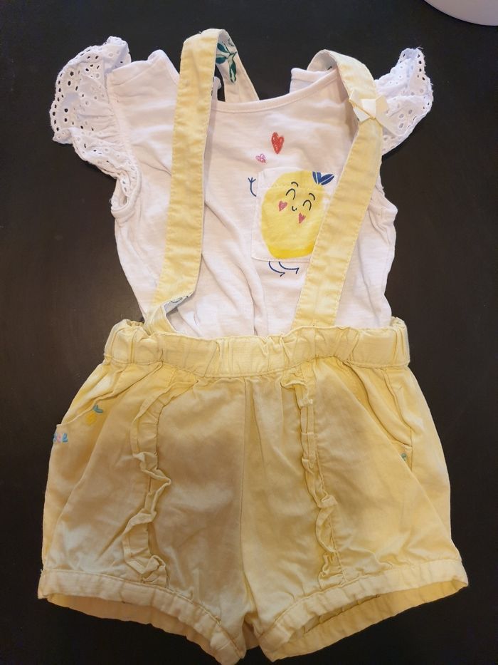 Ensemble short à bretelles taille 12 mois sergent major et son t-shirt dentelle et citron taille 9 mois orchestra