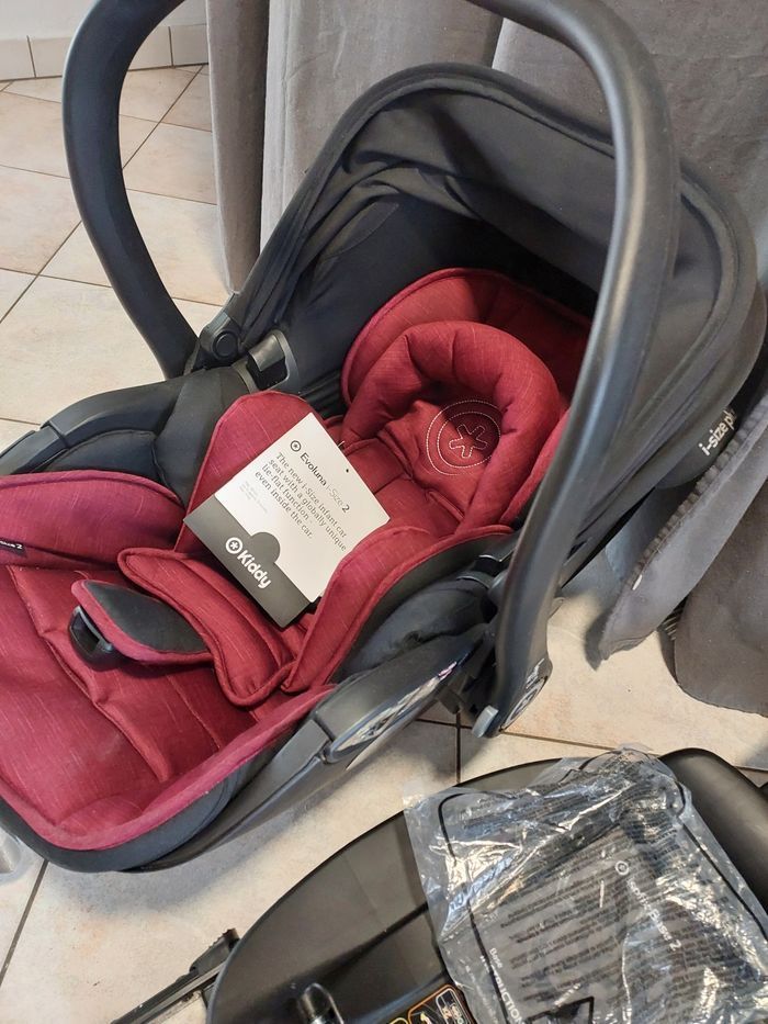 Bonjour Je vends cet ensemble Siege auto/ cosy avec base Marque kiddy Évoluna i size 2 Très bon état Comme neuf Avec notice Des la naissance à 13 kgs Couleur noir et bordeaux Reductzur bébé Capote Sa base Superbe etat Pieds réglable en hauteur Le socle ou se mets le siège coulisse Envoi en chrono uniquement