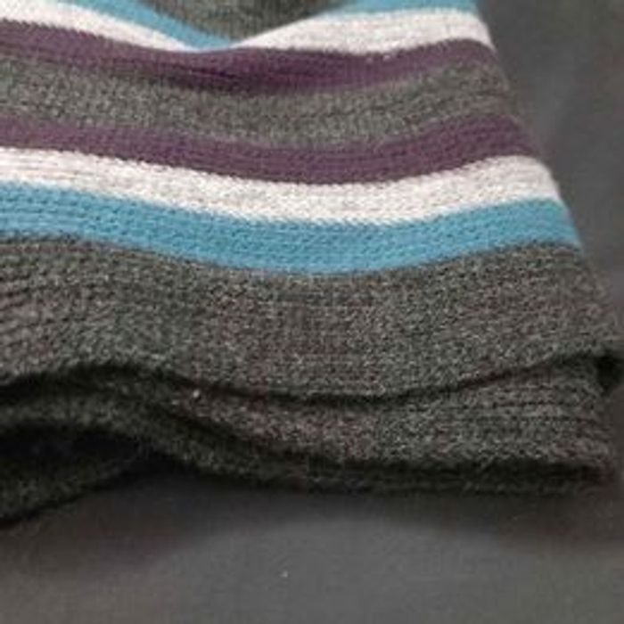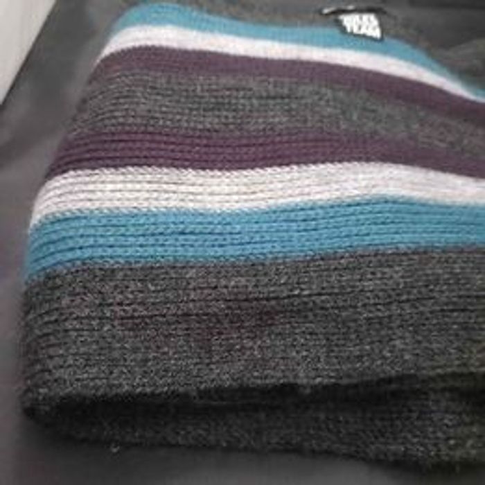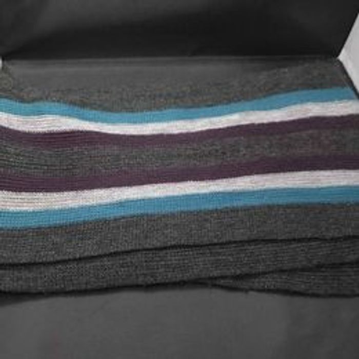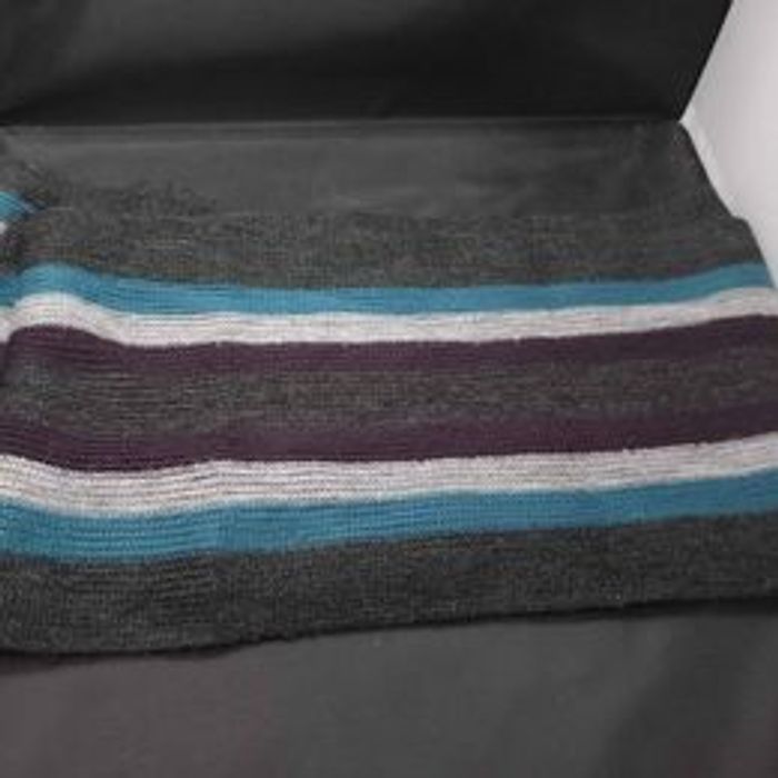 Echarpe homme Couleurs bleu, noir, gris et violet Marque Jules Motifs rayées Matière polyester En très bon état Dimensions approximative 183cm de long : largeur 22cm