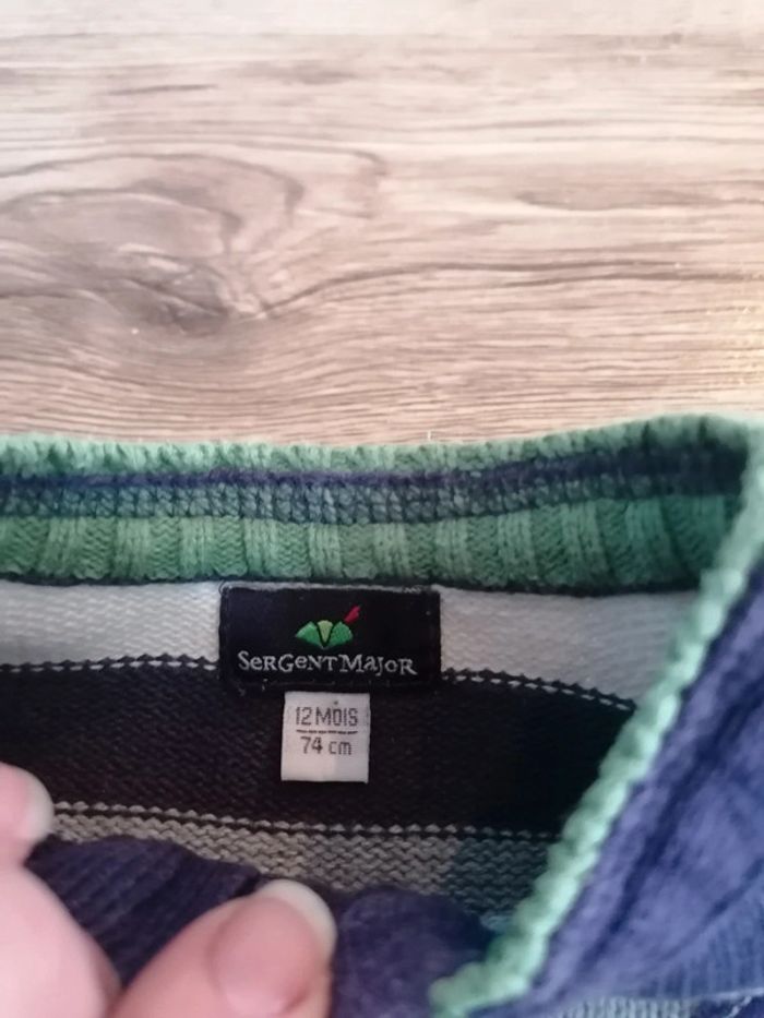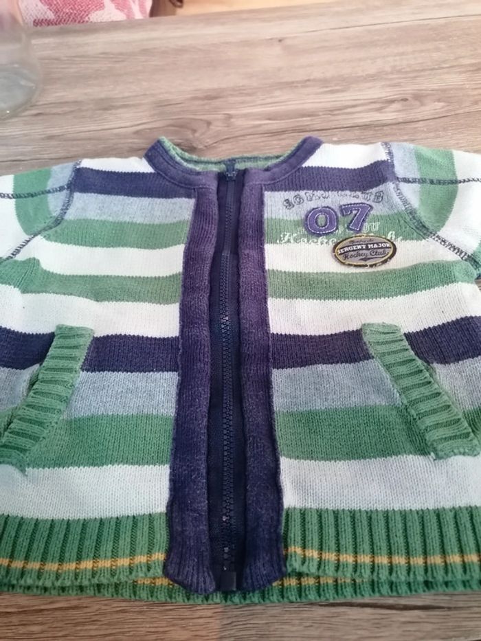 Bonjour, je vends ce gilet rayé violet, blanc et vert de la marque Sergent major taille 12mois en bon état (quelques peluches). Lavé maison non fumeur.