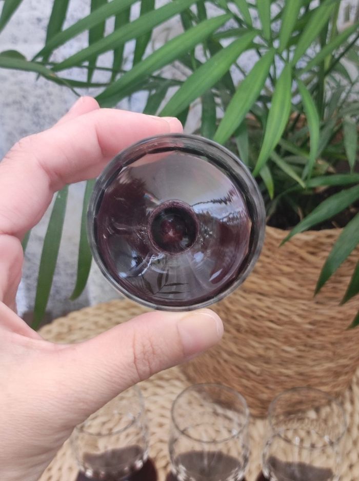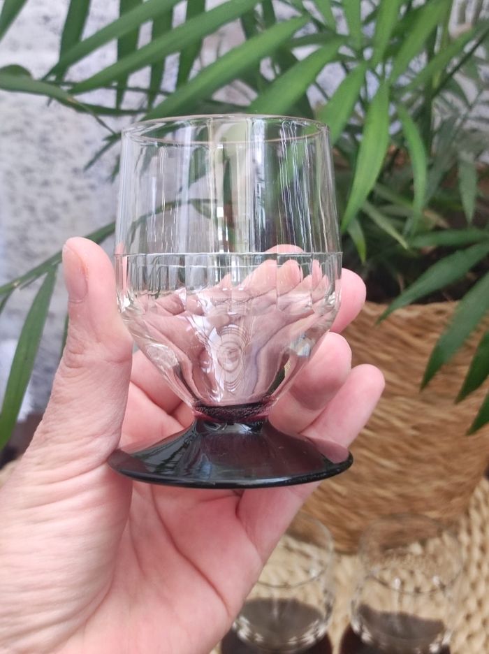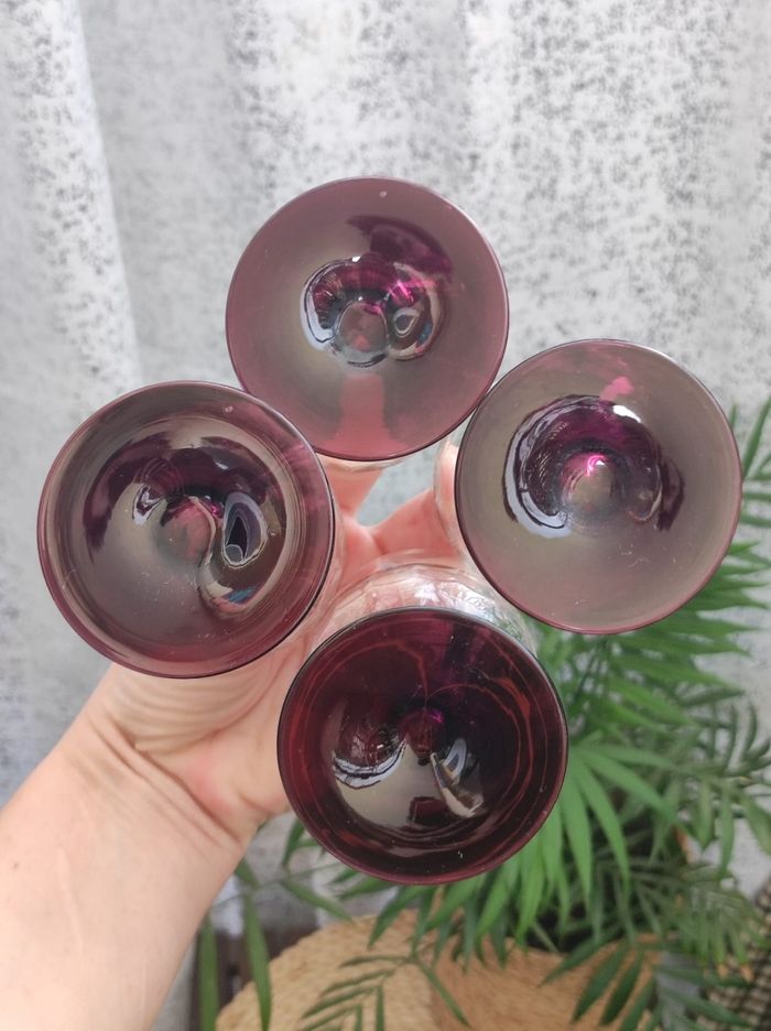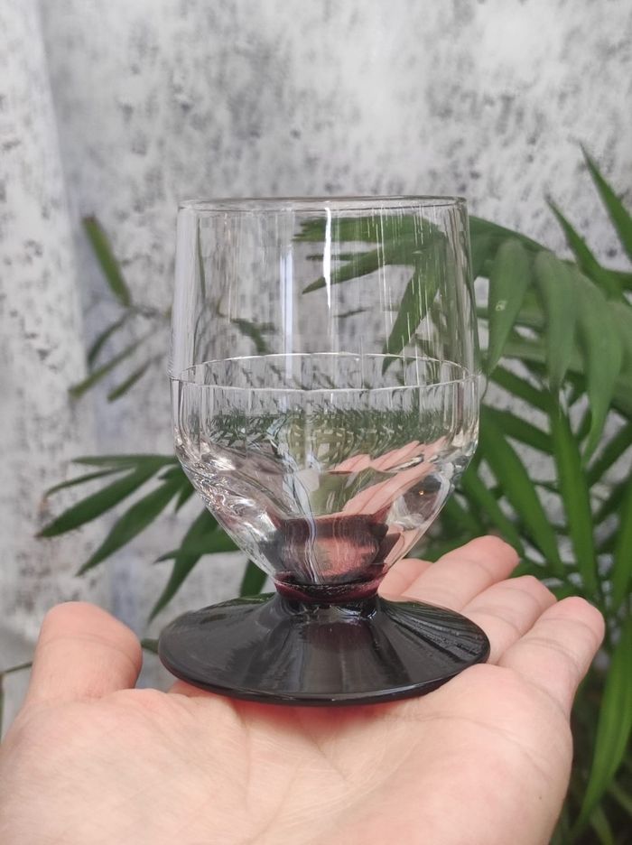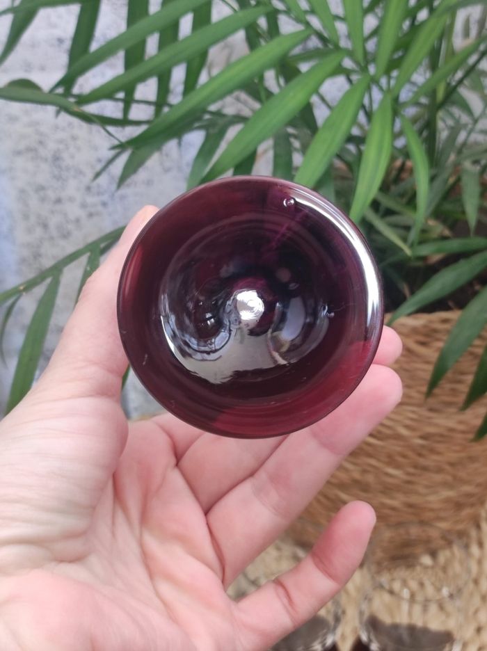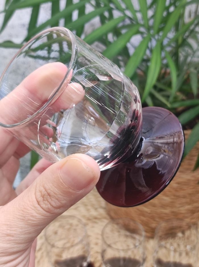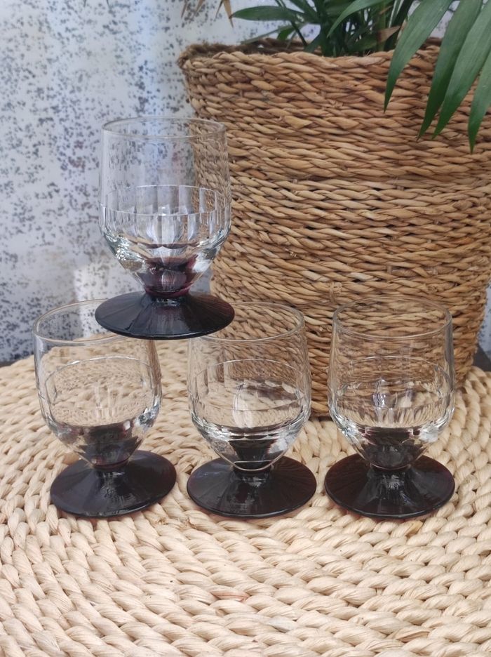 ❌️ ke poids peut étre modifier avant achat Verres a porto vintage fabrication française des années 40. Lot de 4 magnifiques verres art déco en verre transparent et pied aubergine ou violine, de fabrication artisanale des années 40. Verres soufflés élégants et raffinés avec un décor taillé en frise sur le pourtour du verre, montés sur pied de couleur amethiste profond. On distingue très bien les bulles et imperfections du verre, typique de cette époque. Tous En très bon état, exceptionnel! Dimensions: H: 8.5 cm Diam: 5 cm Diam du pied: 6 cm