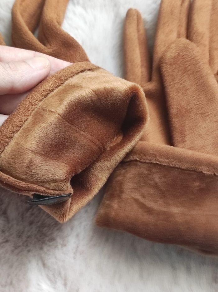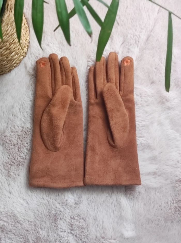 Gants pompons de couleur camel, jamais portée en taille unique pour femme. Doux au toucher comme du daim en extérieur et fourré intérieur. 50% coton et 50% polyester.
