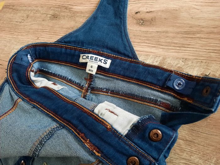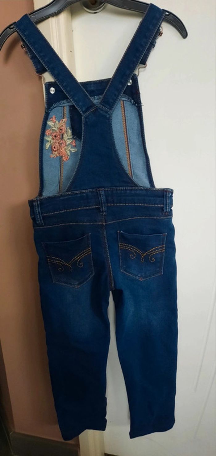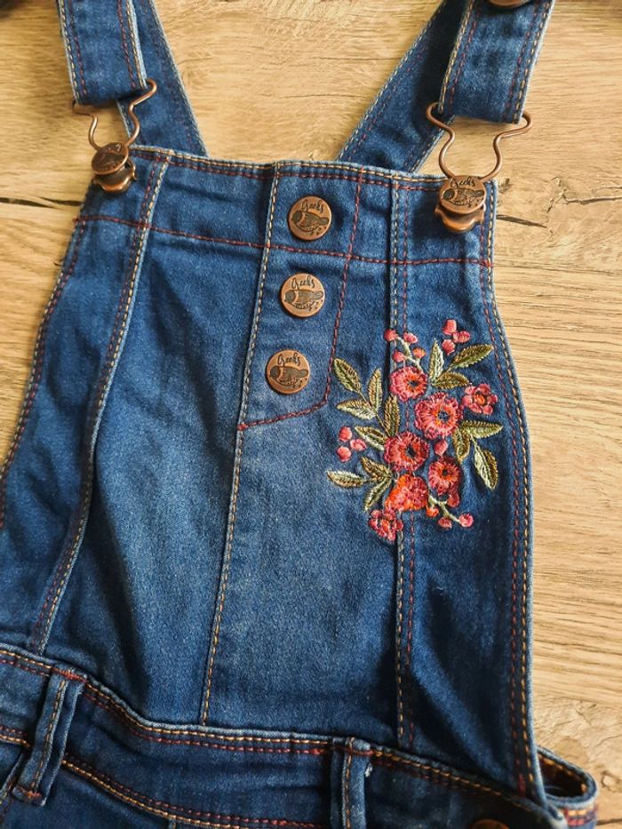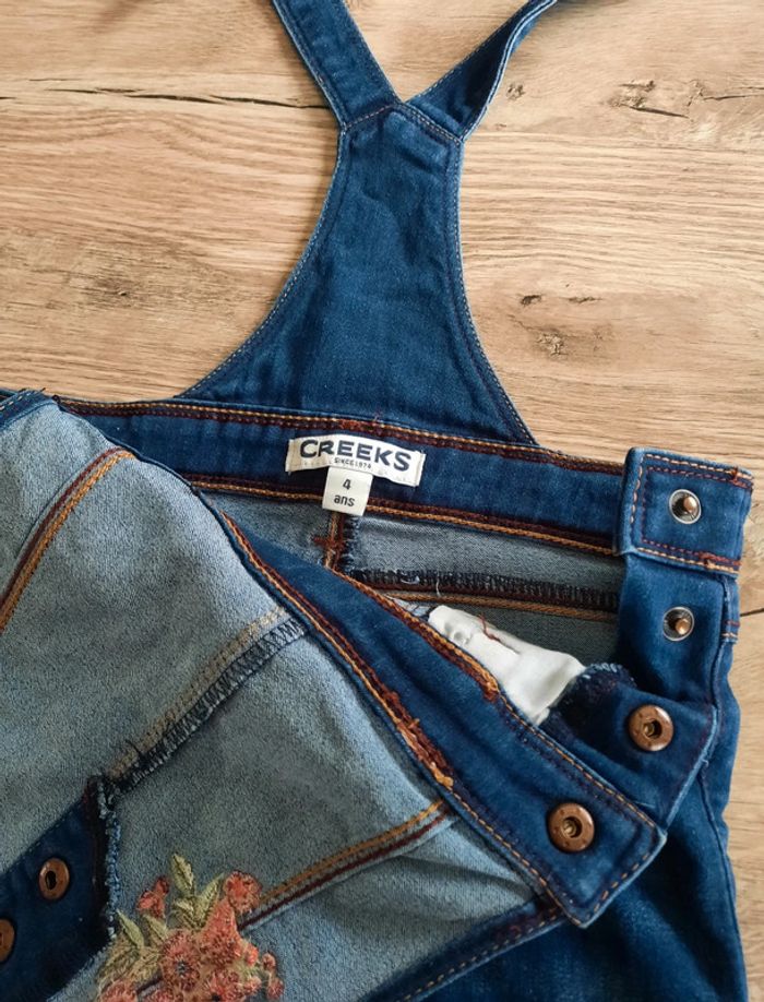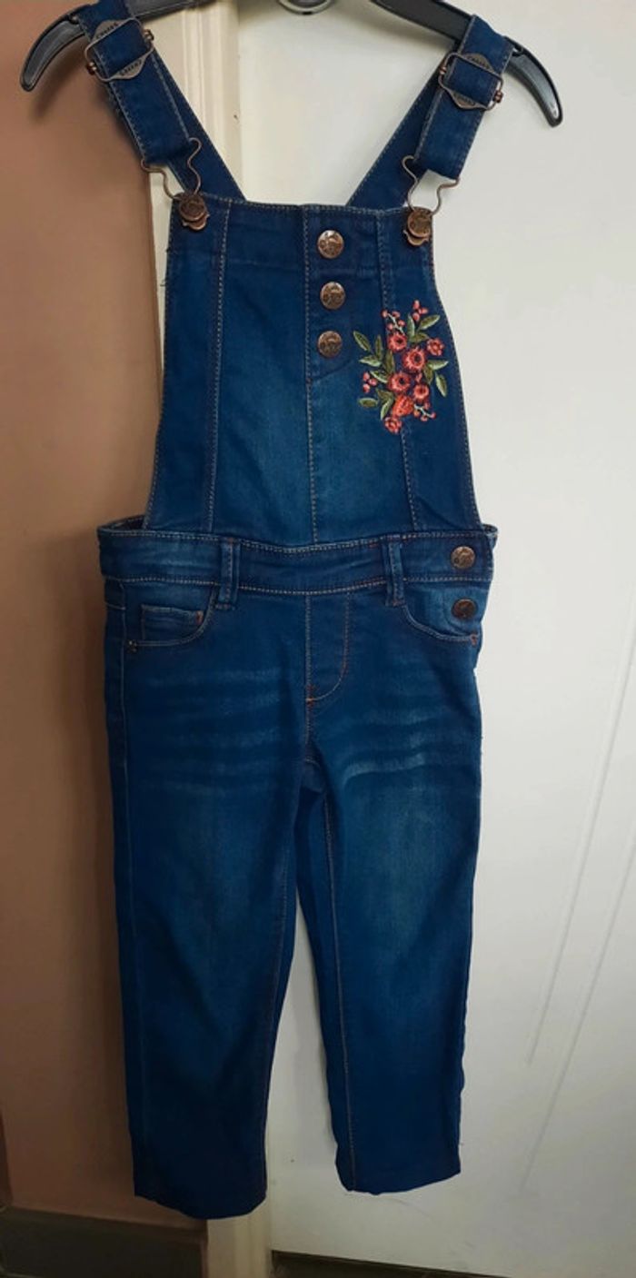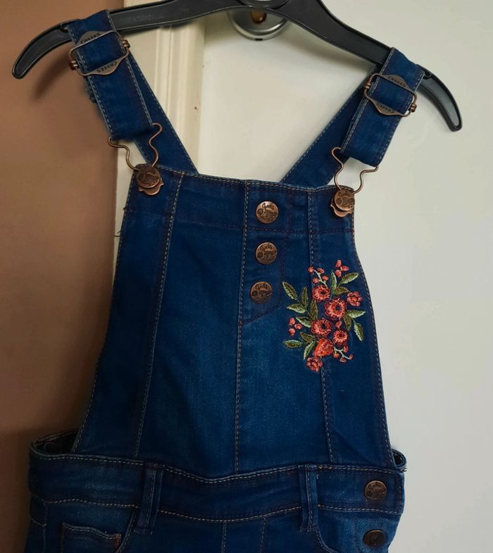 Salopette slim en jean, bleu marine avec motif fleurs multicolores sur le devant. Boutons avec motif oiseaux. De vraies poches devant et derrière! Taille ajustable par système élastique ( voir photos). Très bon état.